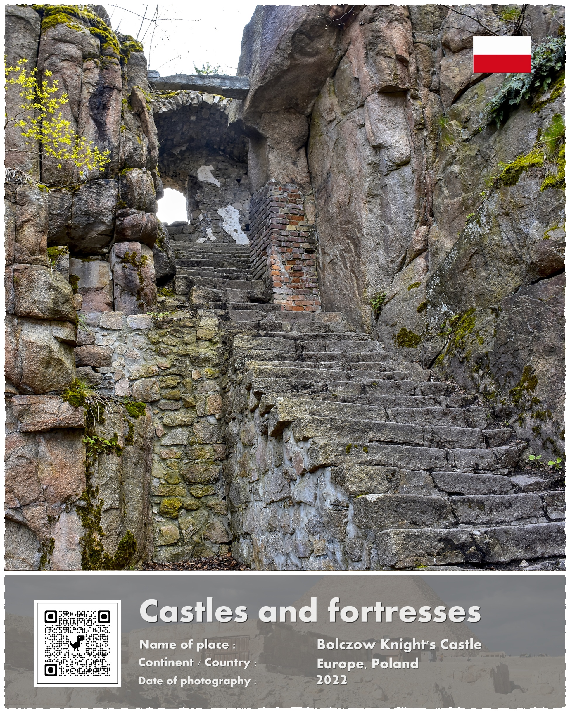 Znajdujące się na szczycie wzgórza skalne ostańce połączono wysokimi murami tworząc dzisiejszy charakterystyczny dziedziniec a wewnątrz powstałej w ten sposób przestrzeni ulokowano domy oraz budynki gospodarcze. Wykuto także kamienne schody wiodące na szczyt zamku które podziwiać można po dziś dzień. Wiodą one na wierzchołek wzniesienia z którego rozciąga się wspaniały widok na całą Kotlinę Jeleniogórską wraz z doskonale widocznym, odległym o 18 kilometrów szczytem Śnieżki.