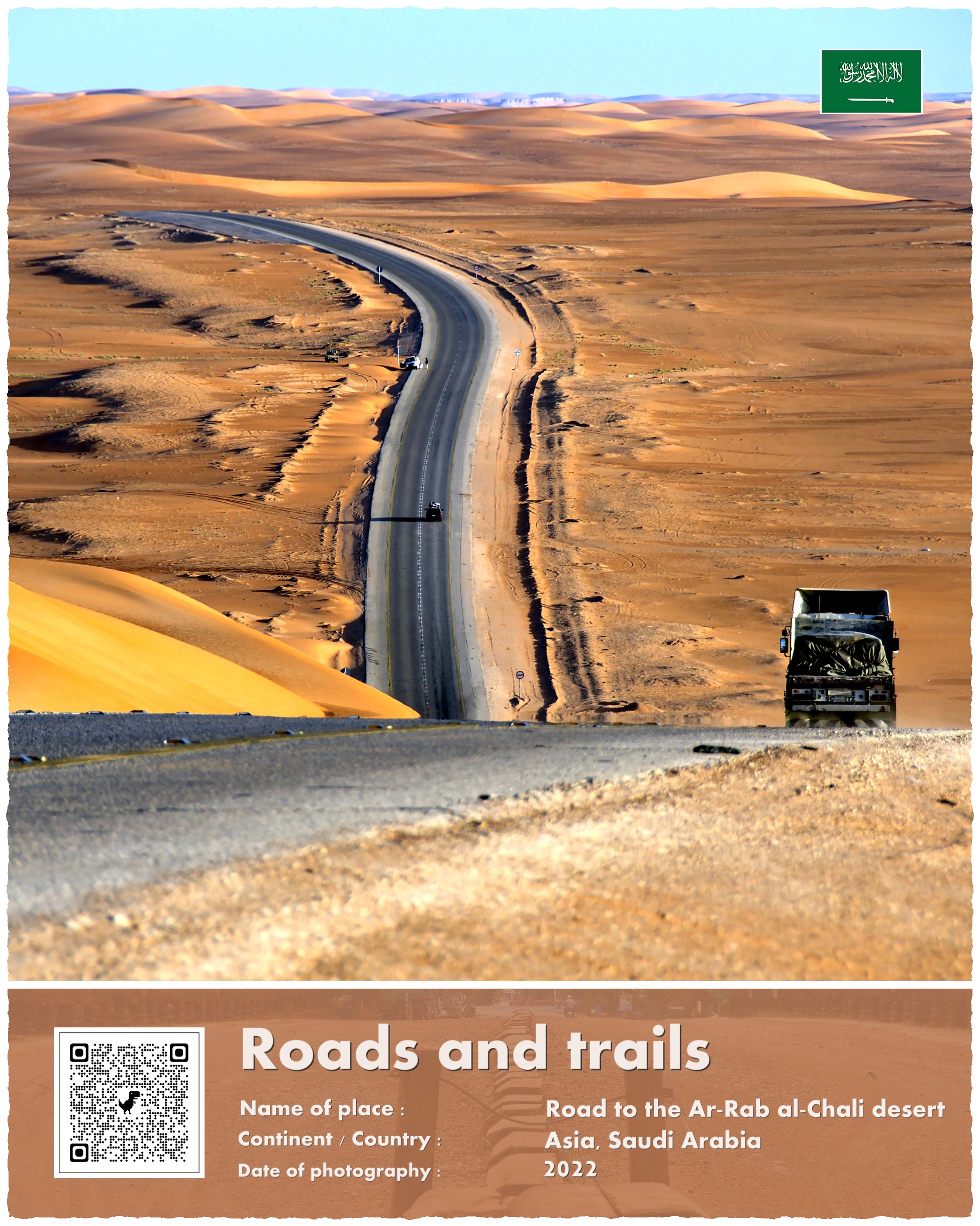 Ar-Rab al-Chali jest pustynią nieprzejezdną. Przecina ją zaledwie kilka dróg, z których większość robi to tylko wzdłuż jej granic, a pozostałe kończą się po kilkudziesięciu kilometrach. Udało nam się znaleźć zaledwie dwie drogi biegnące środkiem rozpalonego interioru, ale nie odważyliśmy się nimi podążyć; raz – ze względu na znajdujące się wzdłuż nich obiekty wojskowe, a dwa – nie posiadaliśmy wiarogodnych danych na temat możliwości uzupełniania na tych trasach paliwa. Zresztą, jak się miało okazać, tankowanie szybko stało się naszym największym wyzwaniem w podróży. Ale o tym za chwilę.