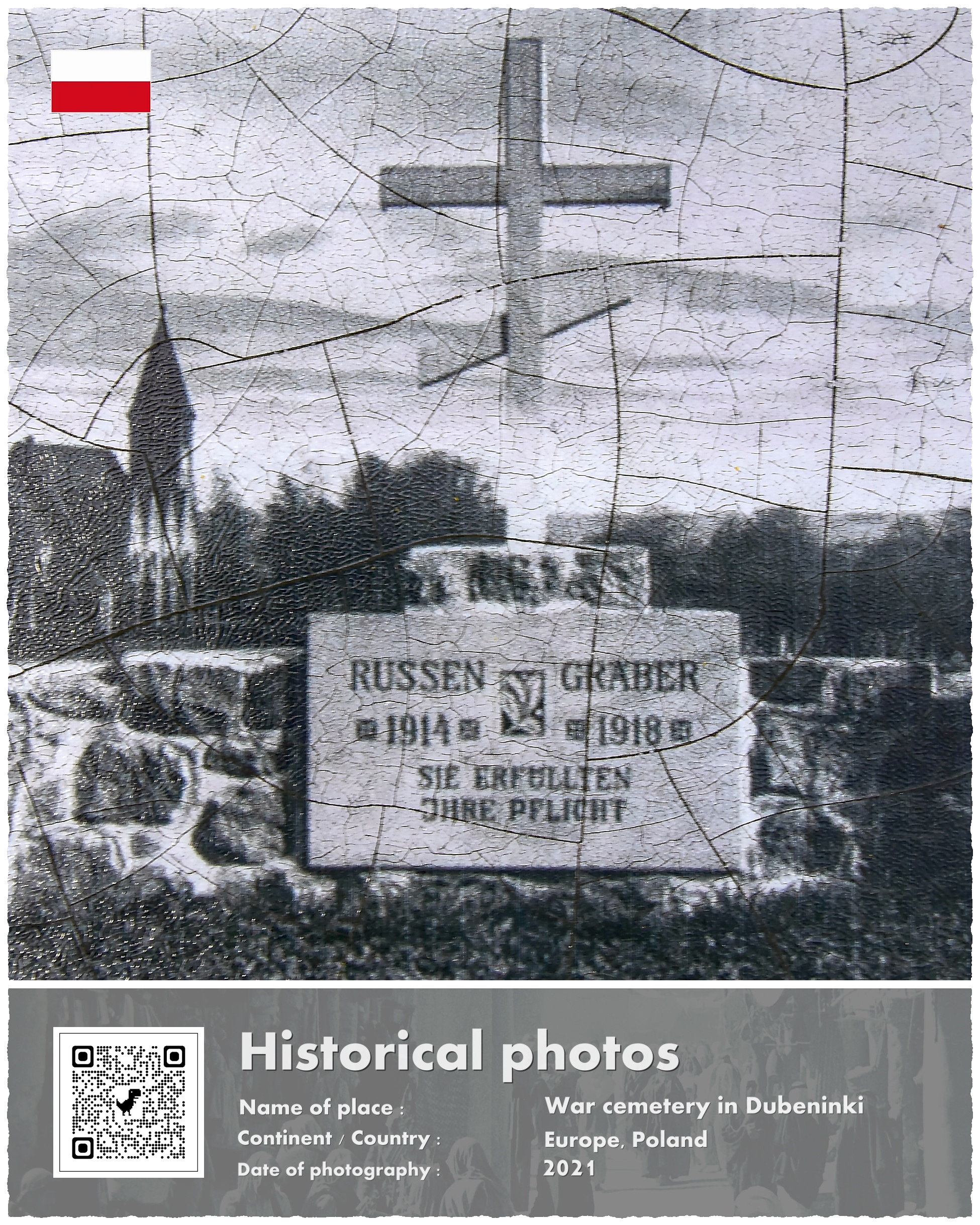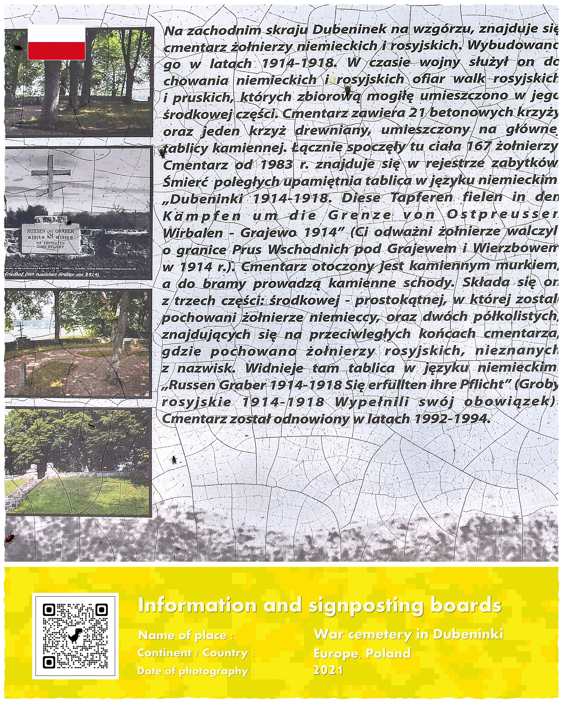 Tablica w języku niemieckim głosi: „Ci odważni żołnierze walczyli o granice Prus Wschodnich pod Grajewem i Wierzbowem w 1914 roku„. Na tablicy w języku rosyjskim zaś czytamy: „Groby rosyjskie 1914-1918, Wypełnili swój obowiązek