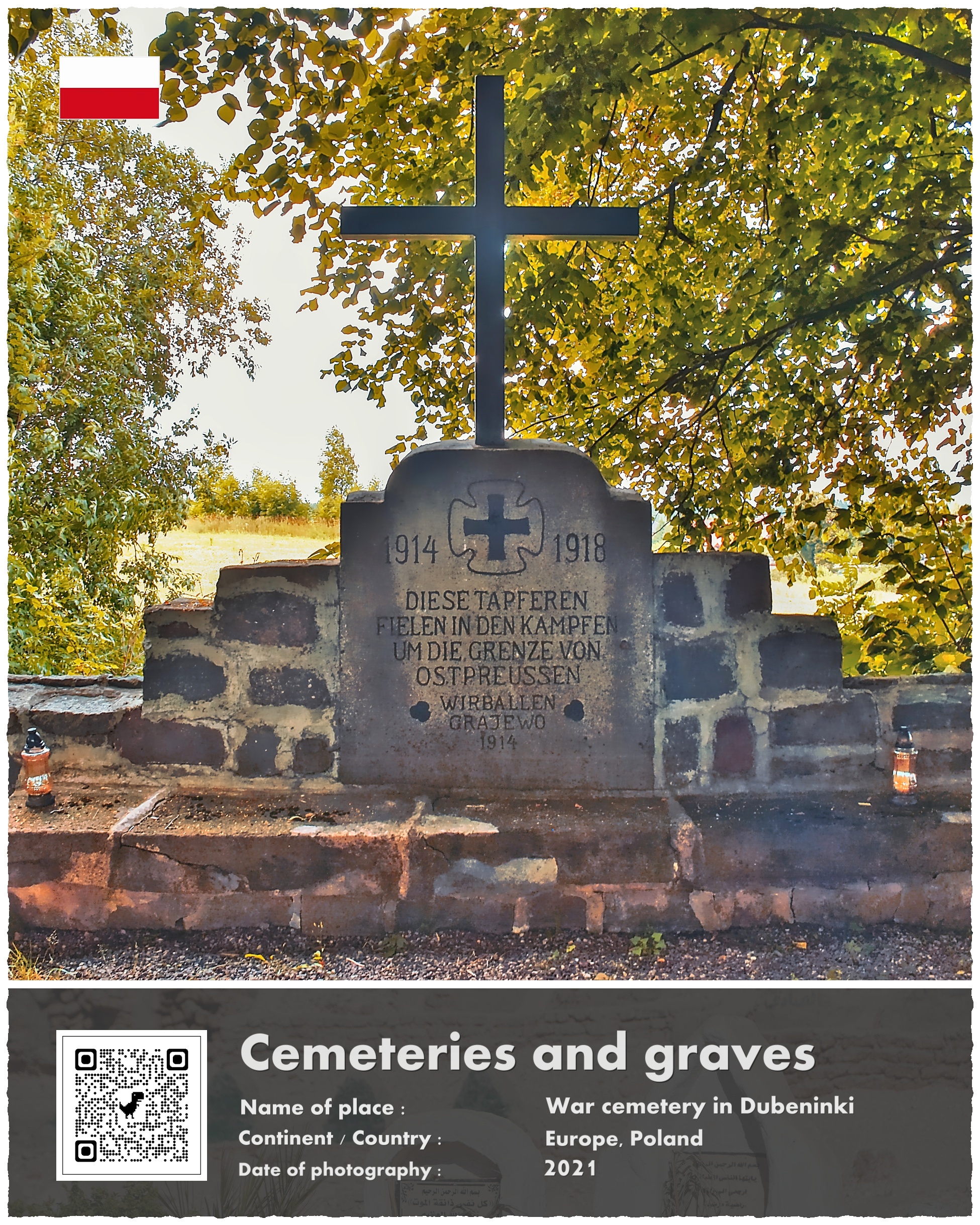Czasem nie trzeba specjalnie daleko podróżować, by trafić na ciekawe miejsce. Bywa, że wystarczy mieć oczy dookoła głowy i szybko podejmować decyzję o użyciu hamulca podczas jazdy. Gdy będziecie przejeżdżać kiedyś przez niewielką wioskę Dubeninki – w kierunku na Gołdap – zatrzymajcie się na chwilę kilkaset metrów za nią. Natraficie na bardzo malowniczo położony niewielki cmentarz, na którym znajdują się mogiły żołnierzy poległych na samym początku I wojny światowej.