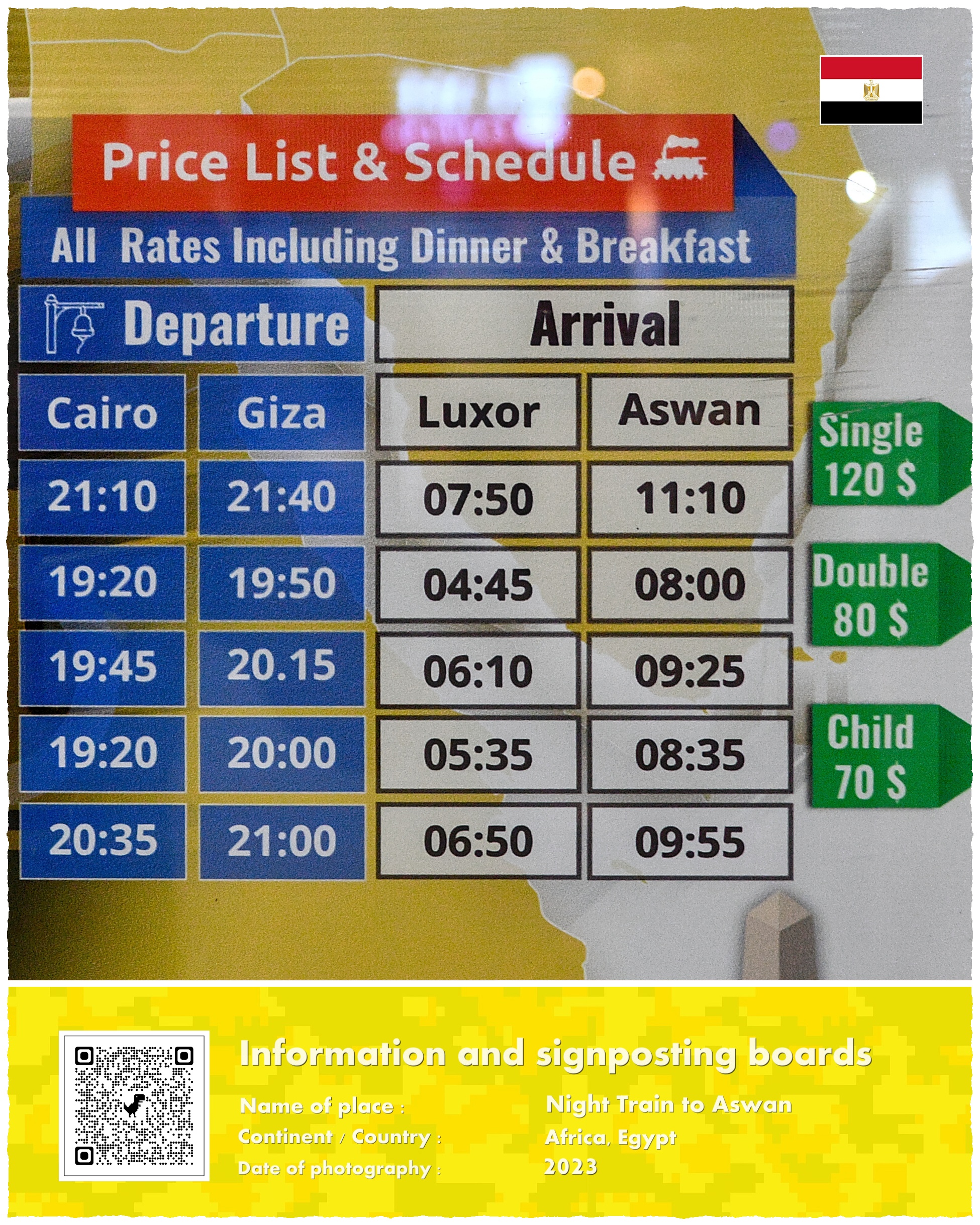 Oba pociągi odjeżdżają z Kairu w godzinach wieczornych. Z jednej strony to dobrze, bo ma się cały dzień na zwiedzanie miasta; z drugiej jednak źle, bo prawie cała podróż odbywa się nocą. W aplikacji można wybrać pociąg odjeżdżający ze stacji Ramzes (położonej w centrum Kairu) o godzinie 19:20 lub 21:01. W pierwszym przypadku do Asuanu dojedziemy o 8:00 rano, a w drugim o 11:10. Główna atrakcja związana z przejazdem, czyli oglądanie Egiptu z okna pędzącego pociągu staje się więc ze względu na ciemności pozbawiona większego sensu…