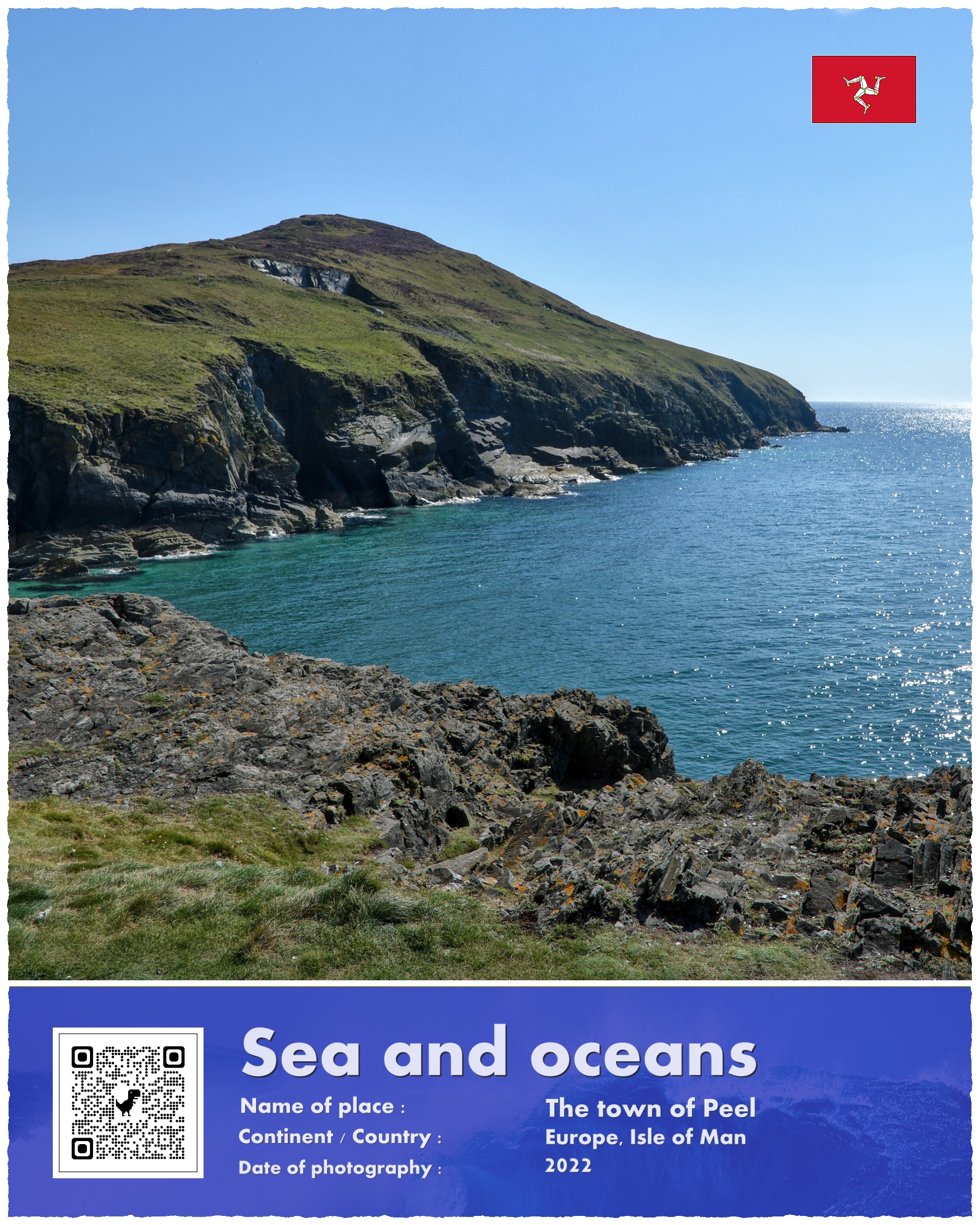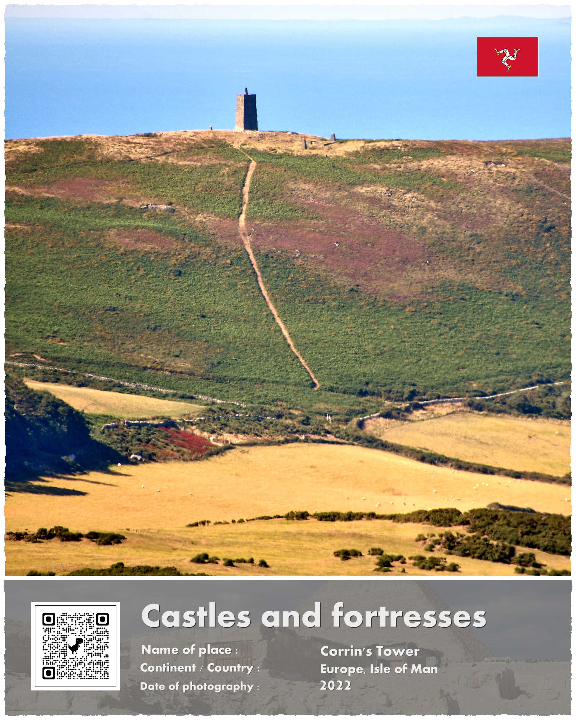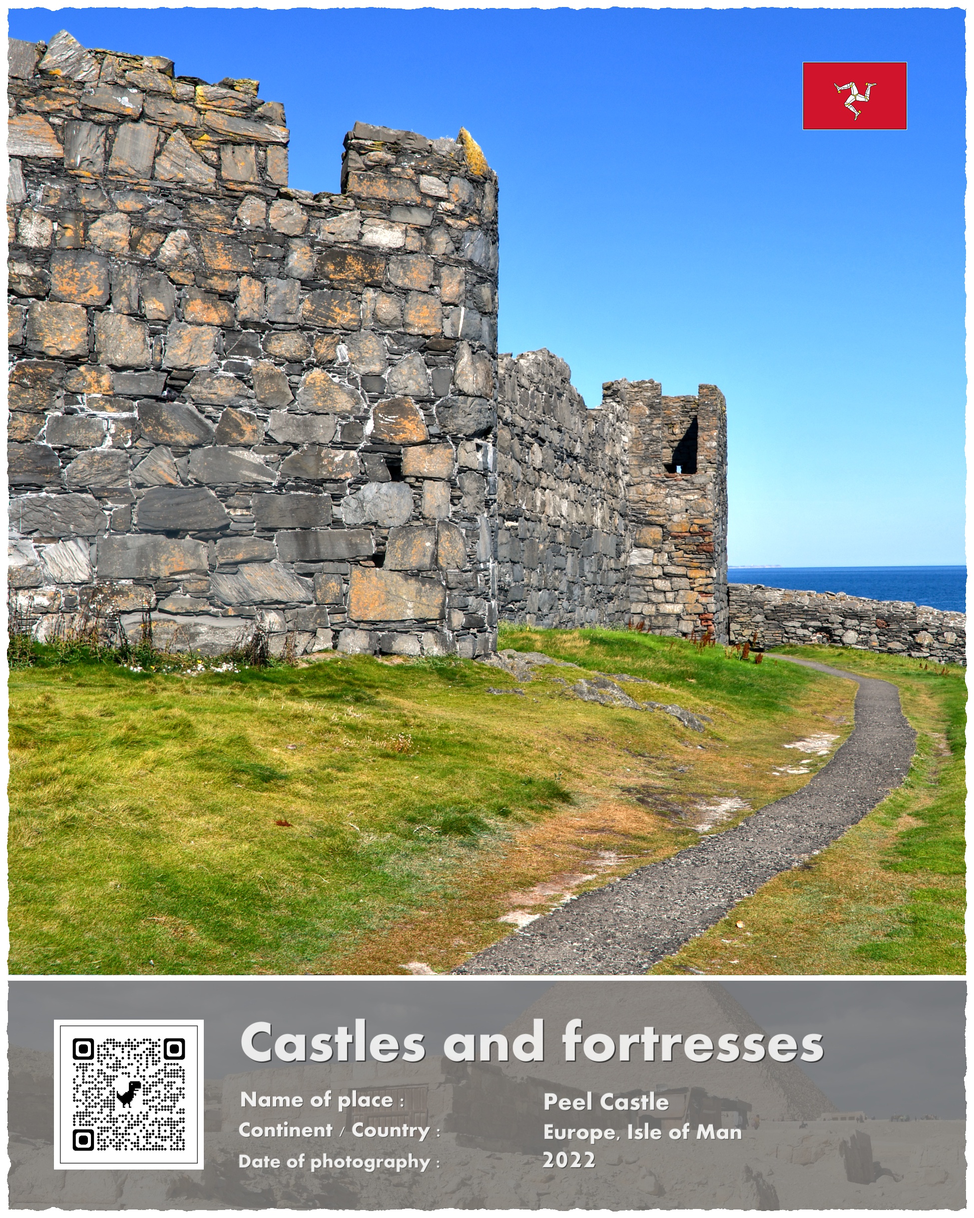 Pamiętam, że obeszliśmy zamek dookoła prowadzącą wzdłuż murów ścieżką – i z tego krótkiego spaceru pochodzą jedyne zdjęcia budowli. Dane satelitarne pokazują, że chyba nie straciliśmy dużo, bo wewnątrz są głównie zawalone i porośnięte trawą ruiny mające kształt ziemnych kopców. Historia każdego zamku musi mieć jakąś ciekawostkę – i tak jest też w tym przypadku: zamek zbudowali Norwegowie (nie mylić z Normanami, aż sprawdziłem czy to nie błąd w tłumaczeniu), a dokładnie wzniesiono go na polecenie Norweskiego Króla Magnusa Bosonogiego (Magnus Barefoot). Ten typowy z charakteru wiking prowadził kampanie wojenne na Morzy Irlandzkim w latach 1098 – 1099, i wtedy to właśnie by zabezpieczyć swe panowania nad nowymi zdobyczami wzniósł w Peel zamek.