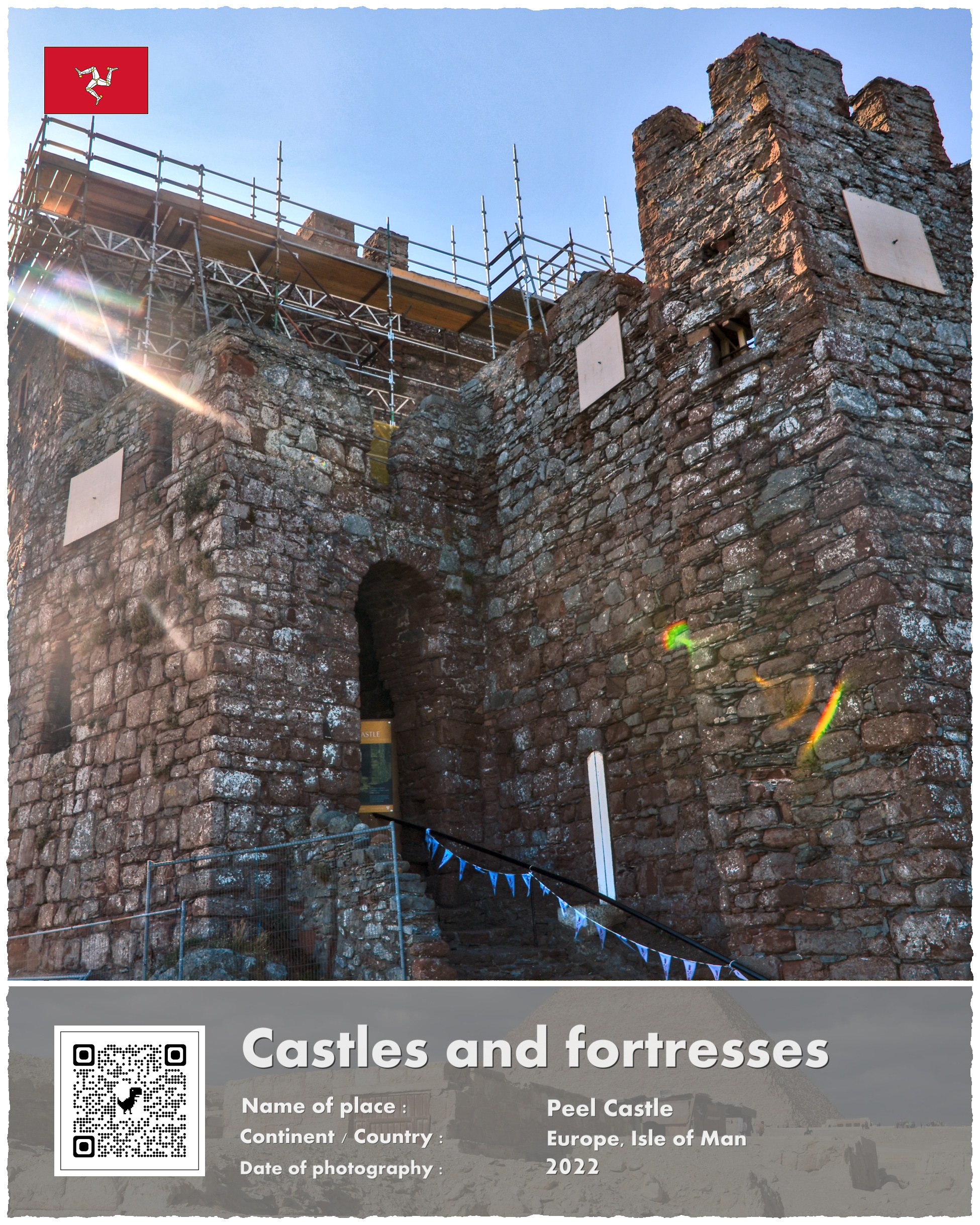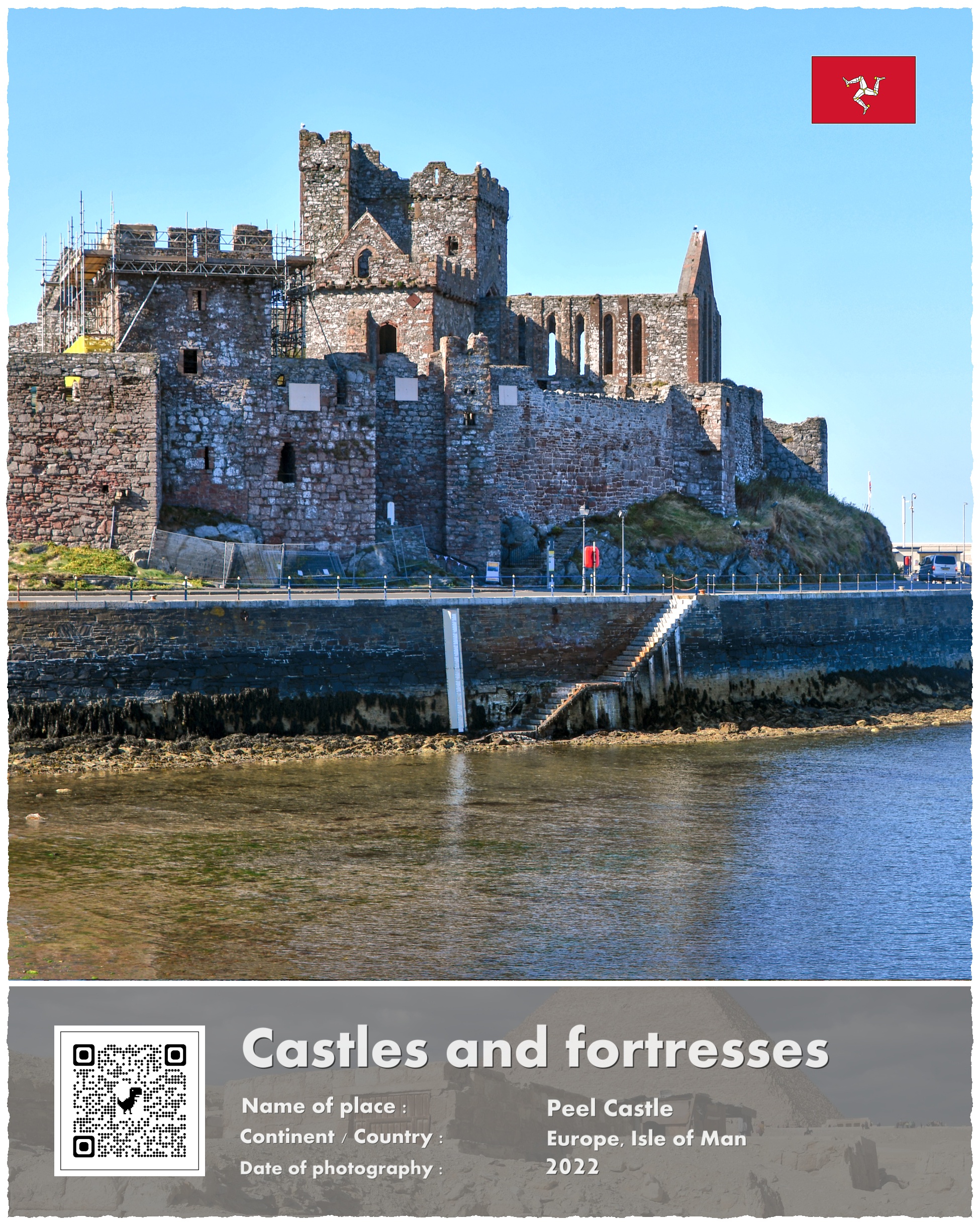 Zamek w miasteczku Peele – Peele Castle – leży na środkowo zachodnim wybrzeżu Wyspy Man. Jego budowę rozpoczęto pod koniec XI wieku, a po wielu historycznych perypetiach związanych ze wszystkim tym, co spotyka na co dzień zamki (oblężenia, pożary i zmiany właścicieli – zasadniczo nie wiadomo co gorsze) jego konstruowanie w formie w jakiej go dziś widzimy zakończono w 1860 roku.