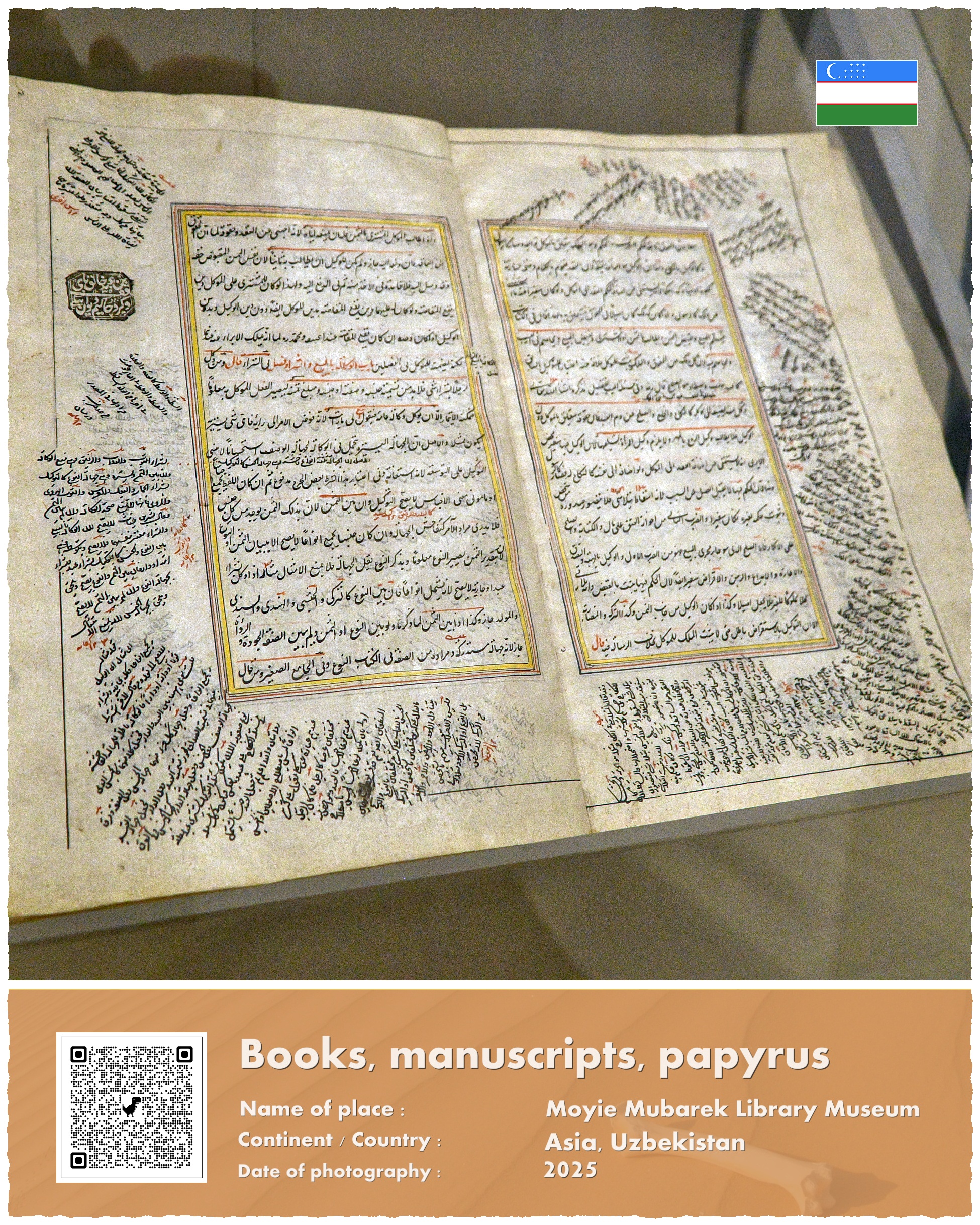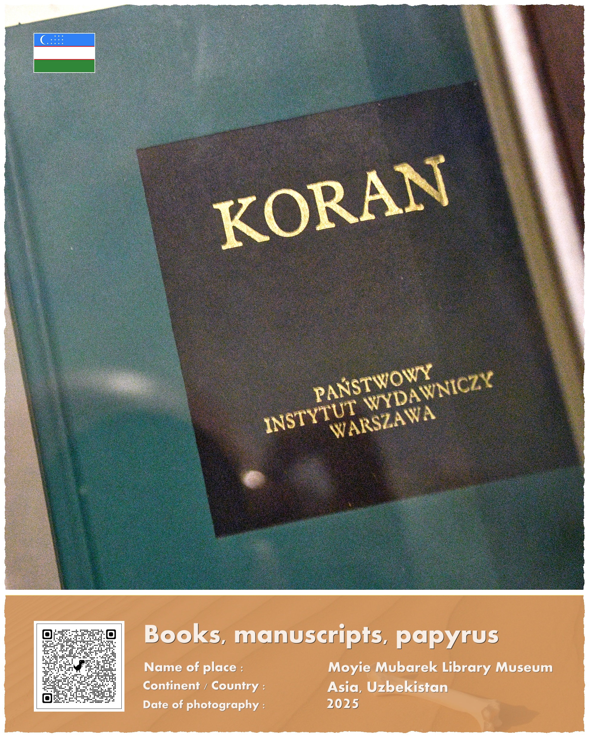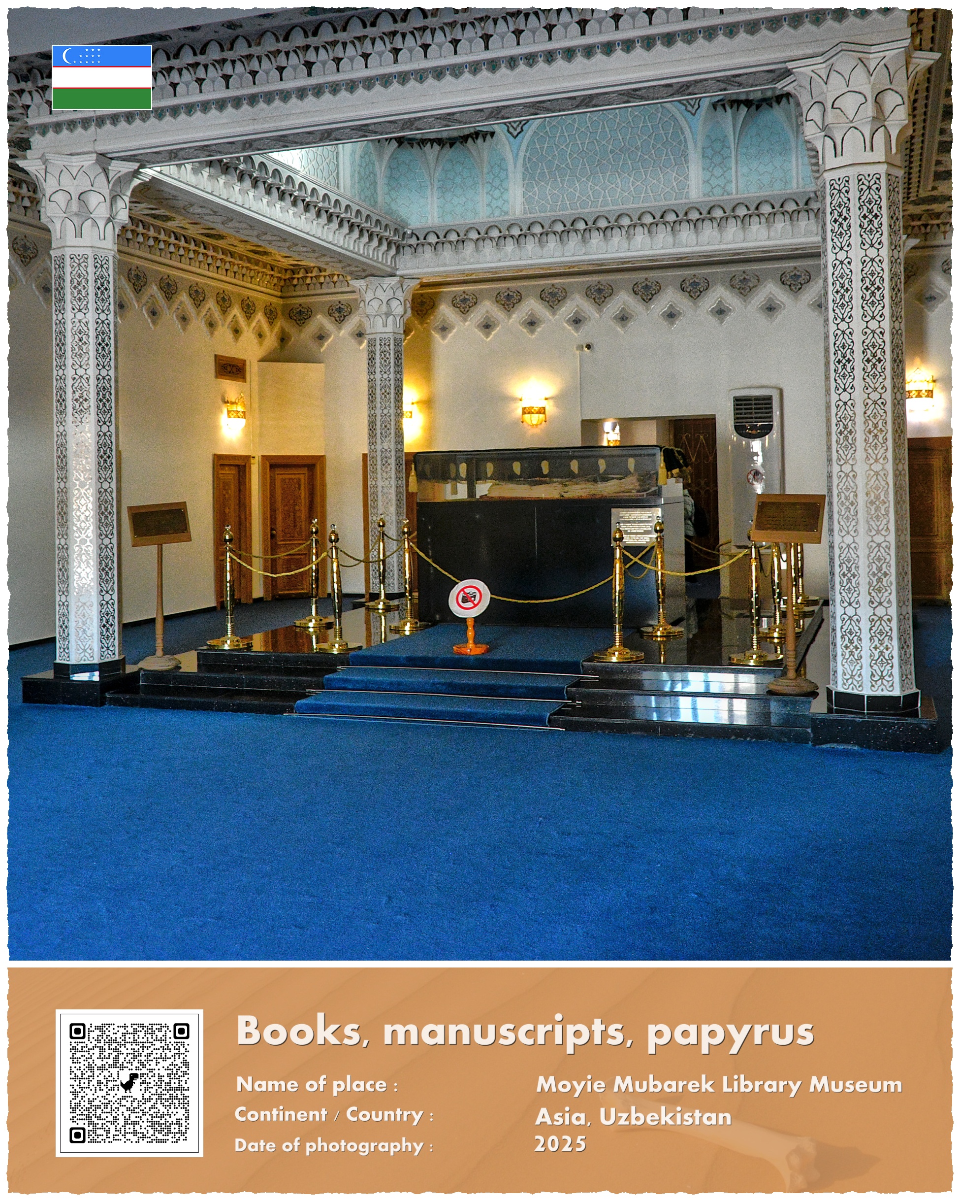 Zabytkowy egzemplarz tego Świętego Pisma zajmuje całą główną salę muzeum i jest strzeżony przez mundurowych, obłożony szkłem, nadzorowany, monitorowany i ciśnieniowany na wszelkie możliwe techniczne sposoby. Nie można robić mu zdjęć z bliska, ale z daleka można – tylko, że ukradkiem. W bocznych salach znajduje się sporo innych ksiąg, lecz nie wiem czy ciekawych – nie umiem czytać w tym języku. Co ciekawe w Taszkencie przechowywane jest jedynie około 1/3 stron tej historycznej księgi; reszta rozsiana jest po różnych instytucjach i kolekcjach na całym świecie.