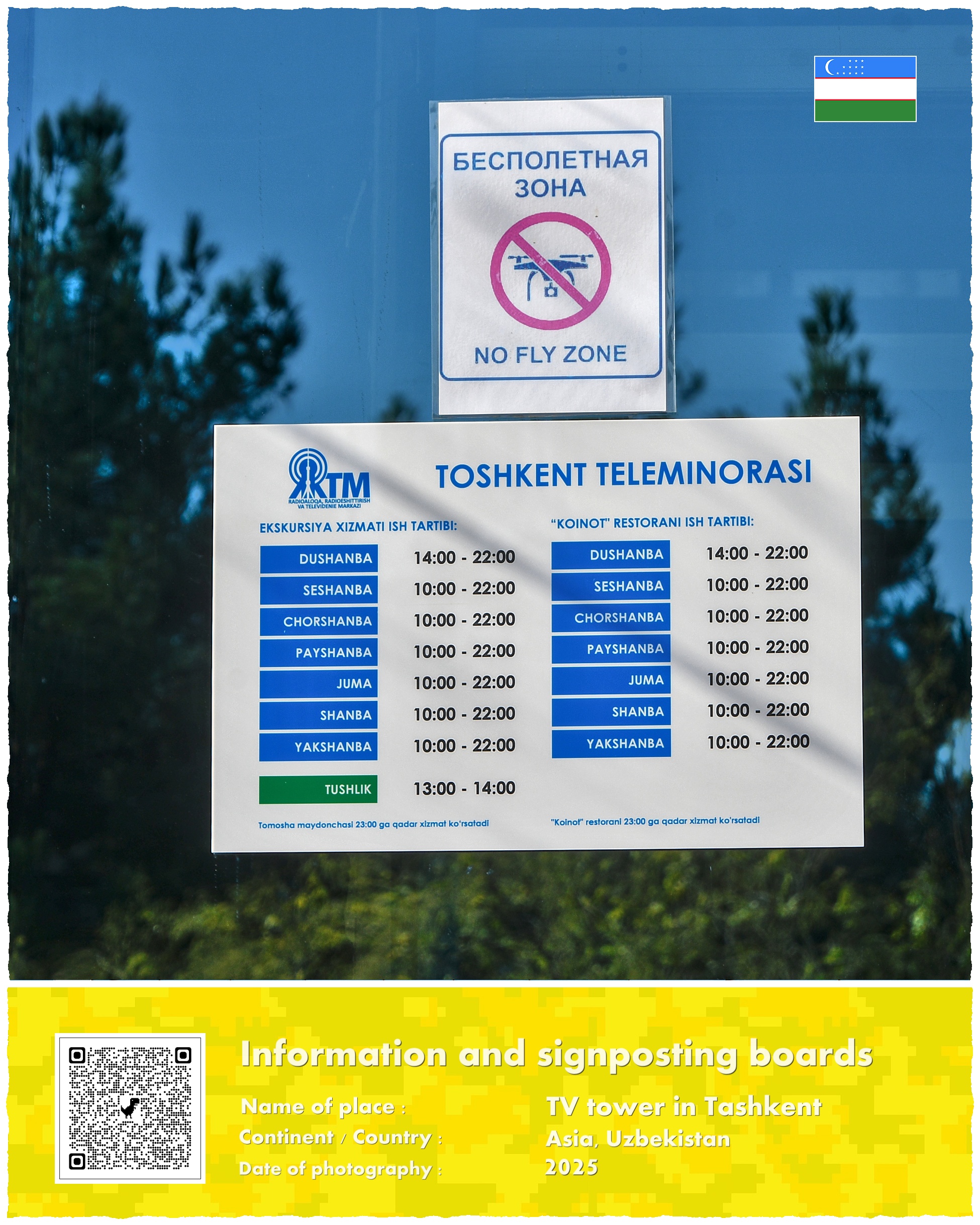 Choć zwiedzając wieżę telewizyjną w Taszkencie nie miałem wysokich oczekiwań, to i tak się zawiodłem – głównie ze względu na przeciętny widok roztaczający się z tarasów. Na usprawiedliwienie napiszę, że byłem już w kilku tego typu obiektach podczas moich podróży po świecie, i nigdzie mi się nie podobało – włącznie z tarasami w wieżowcu Tajpej 101 (509 metrów wysokości, ultranowoczesny budynek na Tajwanie). Tego typu atrakcje nie imponują mi, bo przecież takie same (lub dużo lepsze!) widoki mamy w samolotach czy w górach.