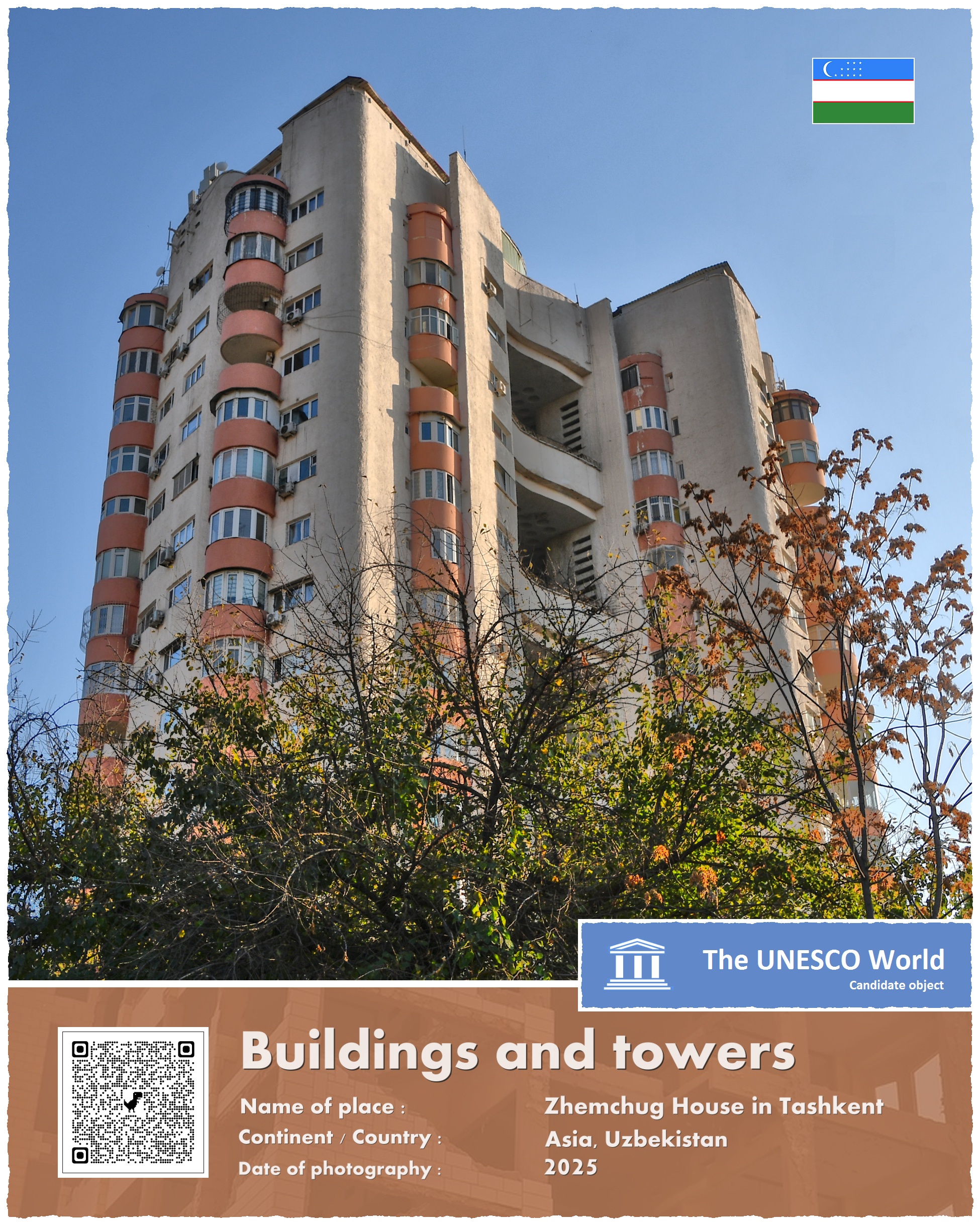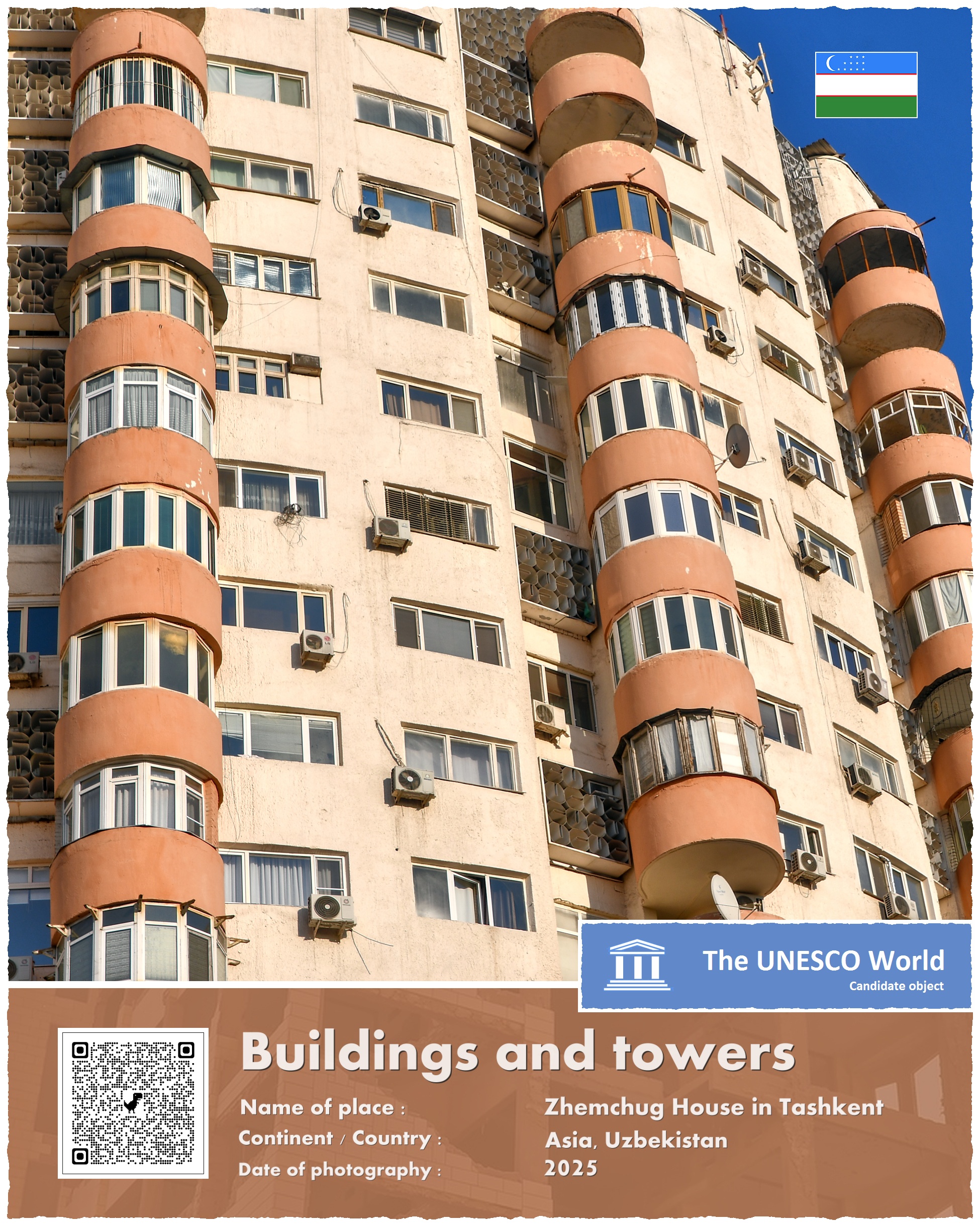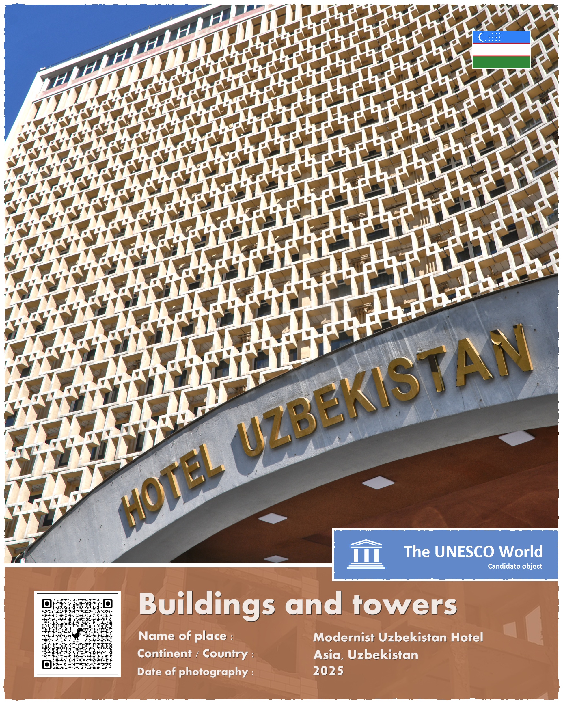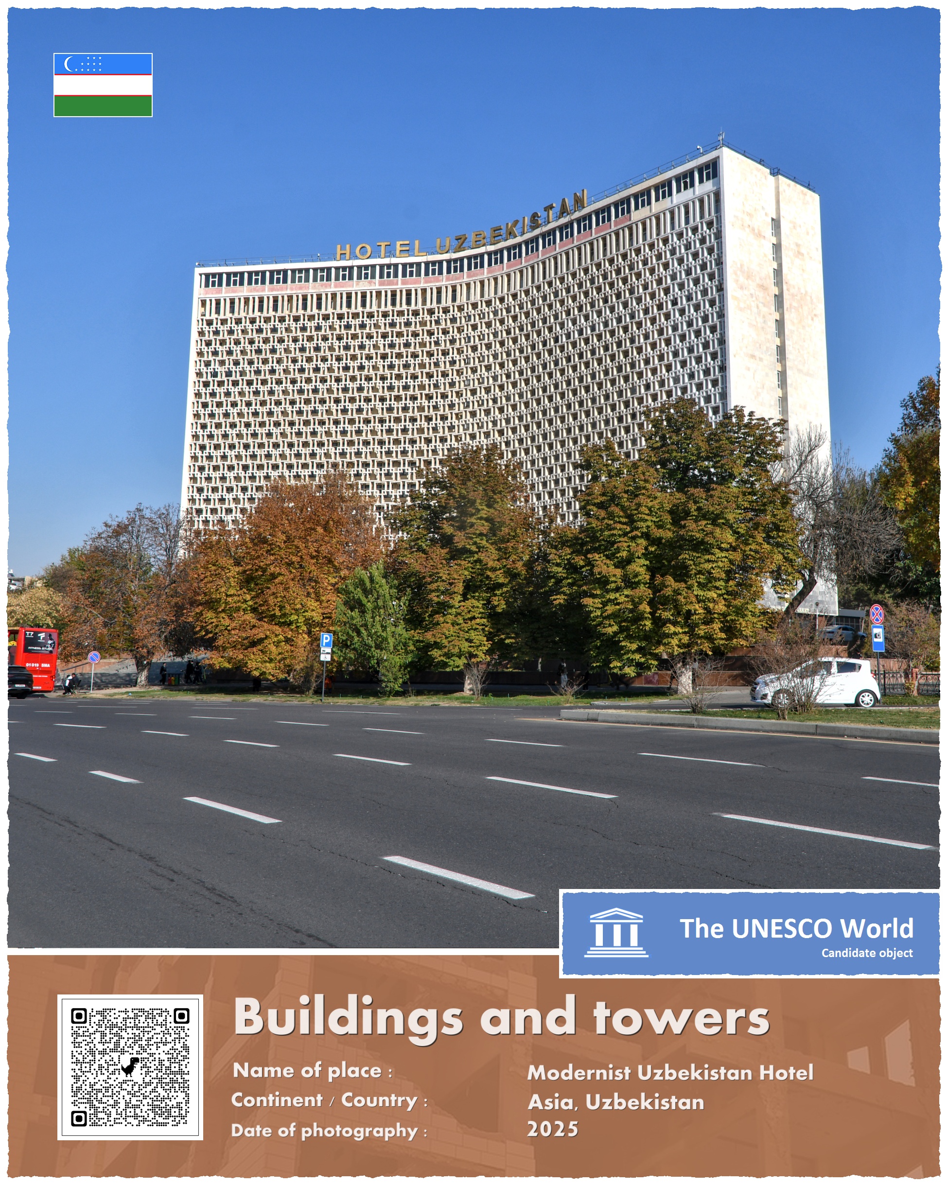 Trudno mi z entuzjazmem podejść do opisania owych miejsc: są one bardzo nierówne pod względem wartości, oraz dość zróżnicowane tematycznie. Taki na przykład Budynek mieszkalny Zhemchug jest zwykłym 15-piętrowym blokiem, i mógłby stać sobie niezauważony na jakimś większym blokowisku. Z kolei Uzbekistan Hotel jest fajny i chętnie byśmy w nim zamieszkali – ale niestety w terminie naszego pobytu wszystkie pokoje były wynajęte (ponad 200), więc mogliśmy tylko wypić w nim kawę.