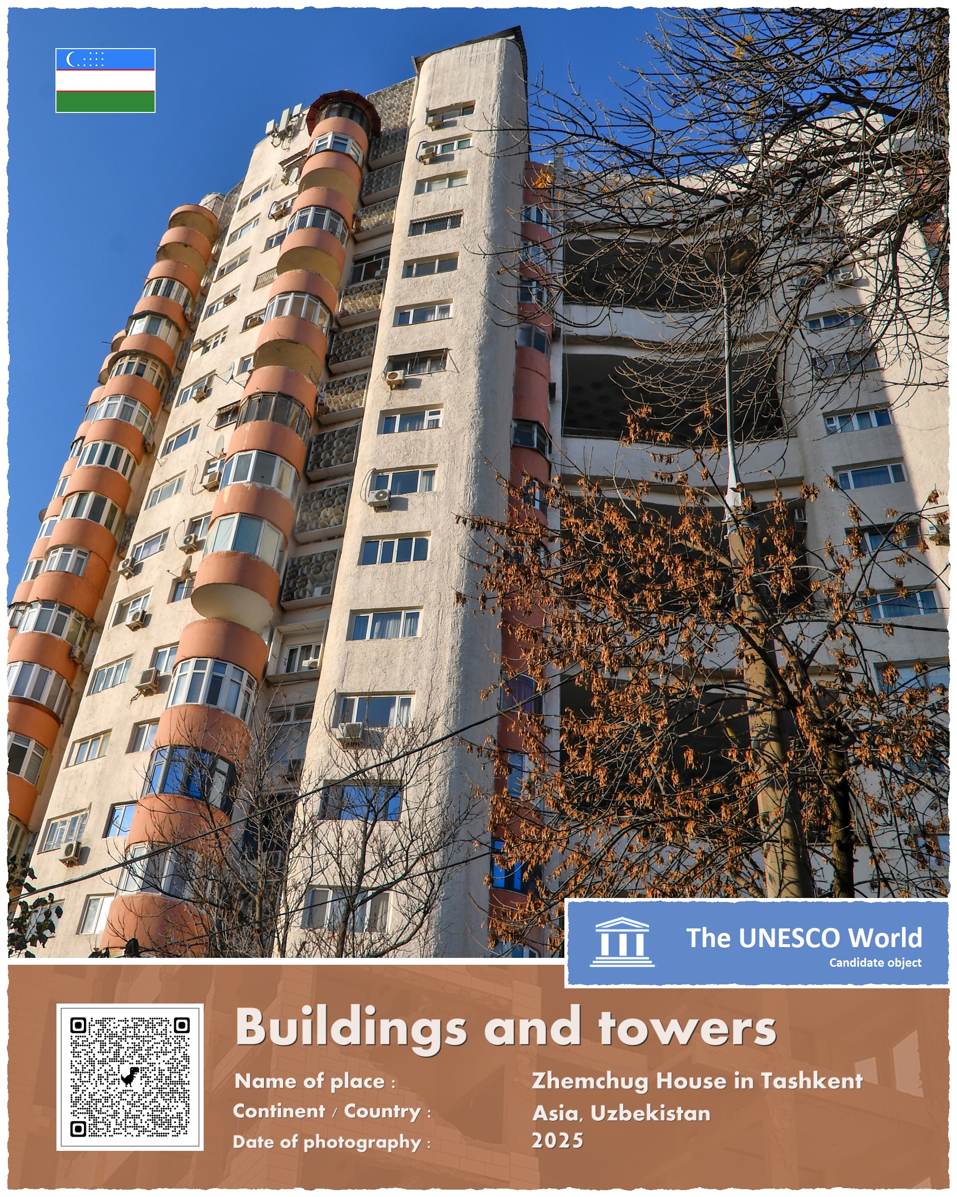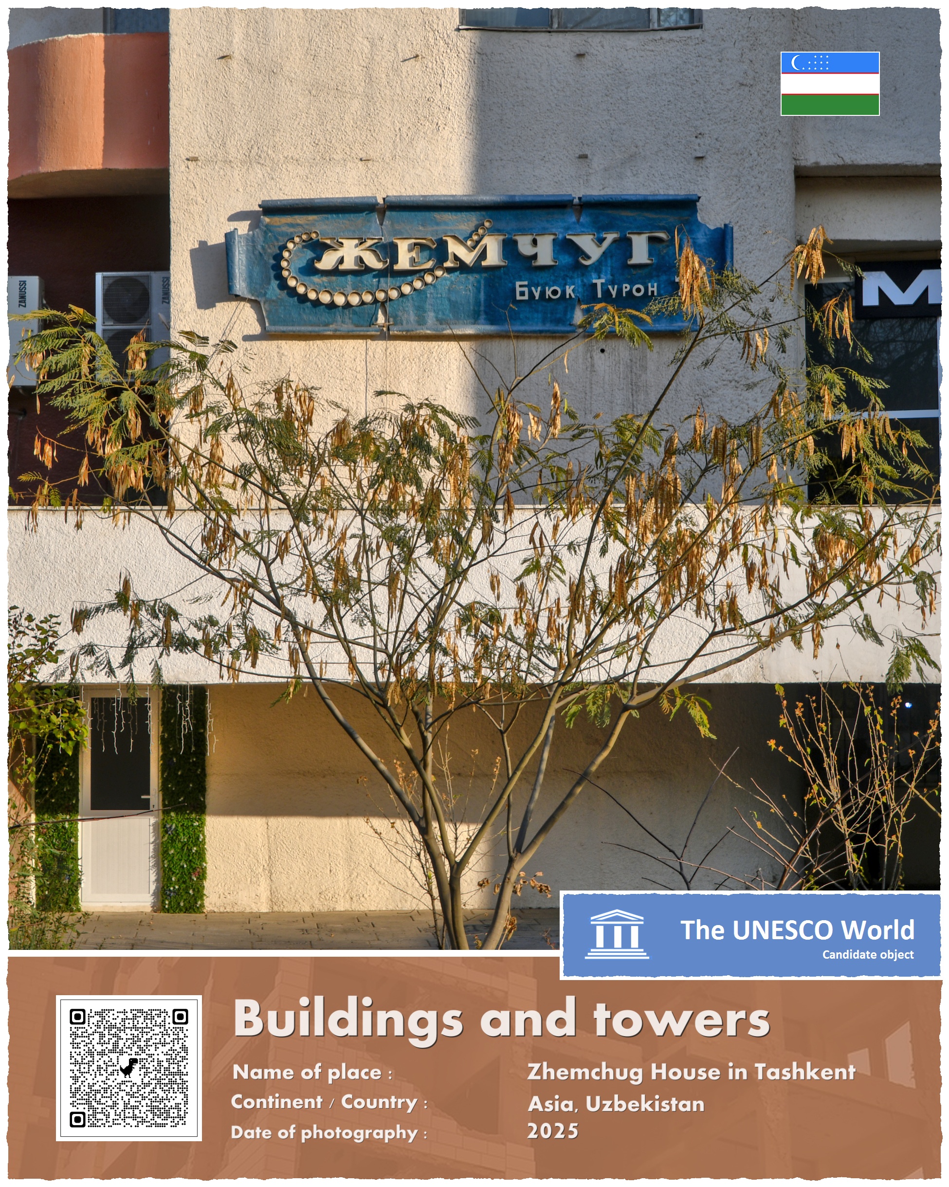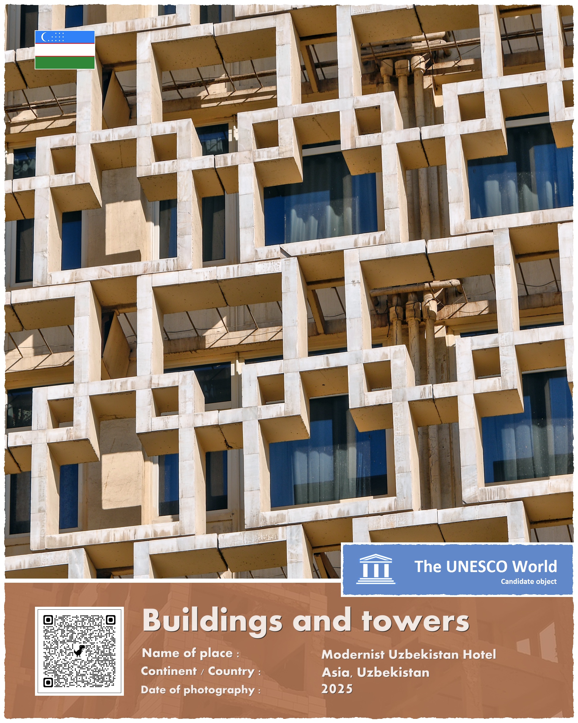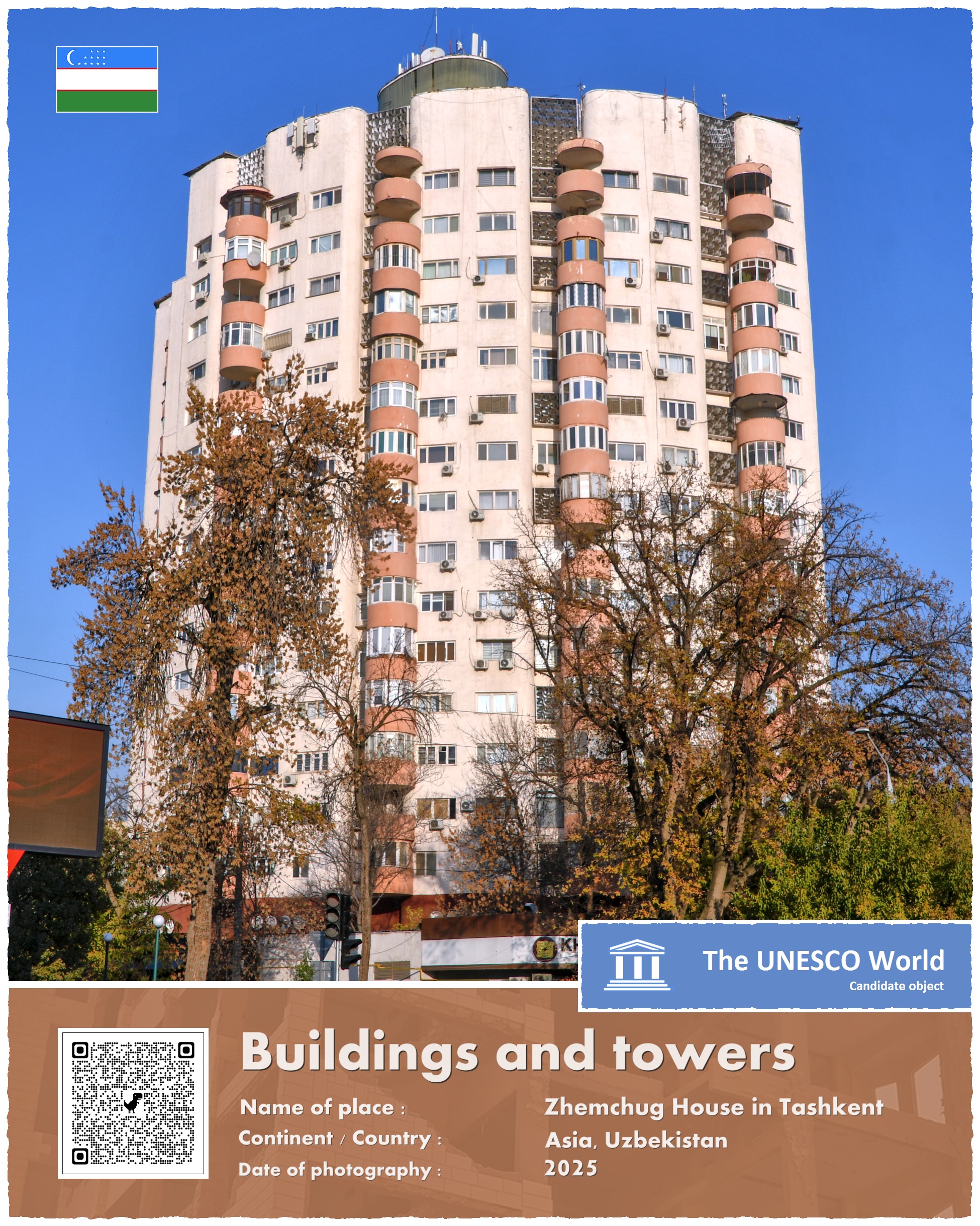Trudno mi z entuzjazmem podejść do opisania owych miejsc: są one bardzo nierówne pod względem wartości, oraz dość zróżnicowane tematycznie. Taki na przykład Budynek mieszkalny Zhemchug jest zwykłym 15-piętrowym blokiem, i mógłby stać sobie niezauważony na jakimś większym blokowisku. Z kolei Uzbekistan Hotel jest fajny i chętnie byśmy w nim zamieszkali – ale niestety w terminie naszego pobytu wszystkie pokoje były wynajęte (ponad 200), więc mogliśmy tylko wypić w nim kawę.