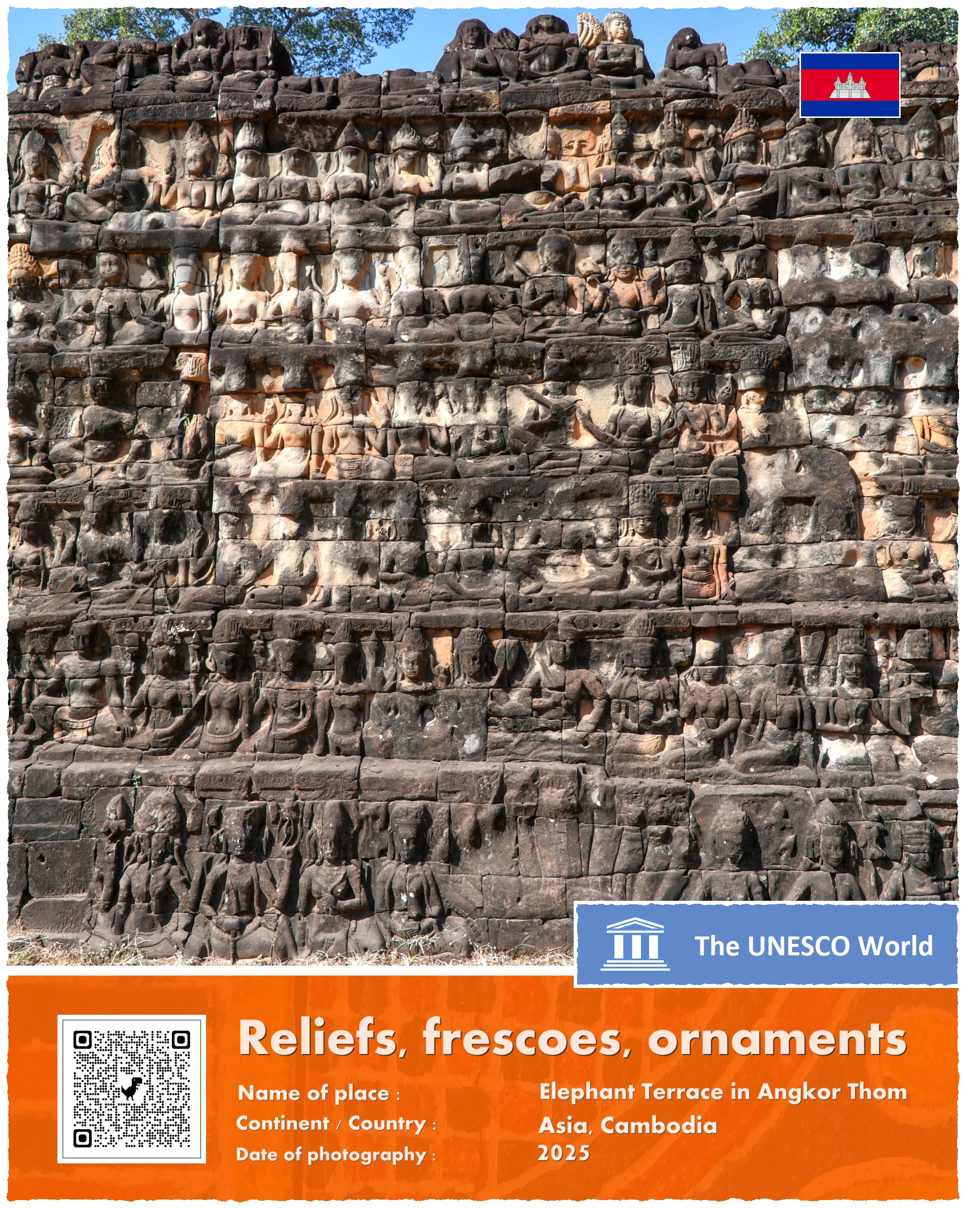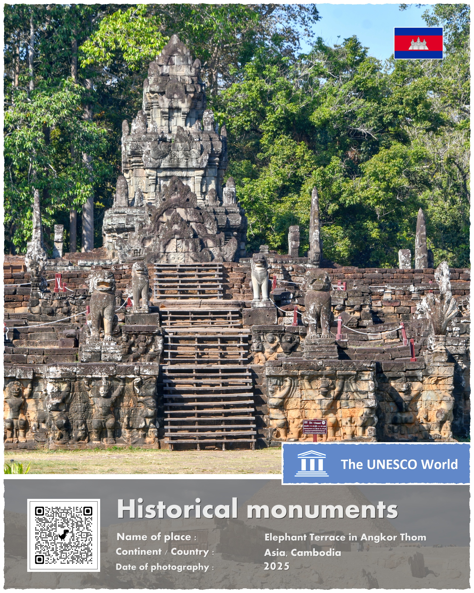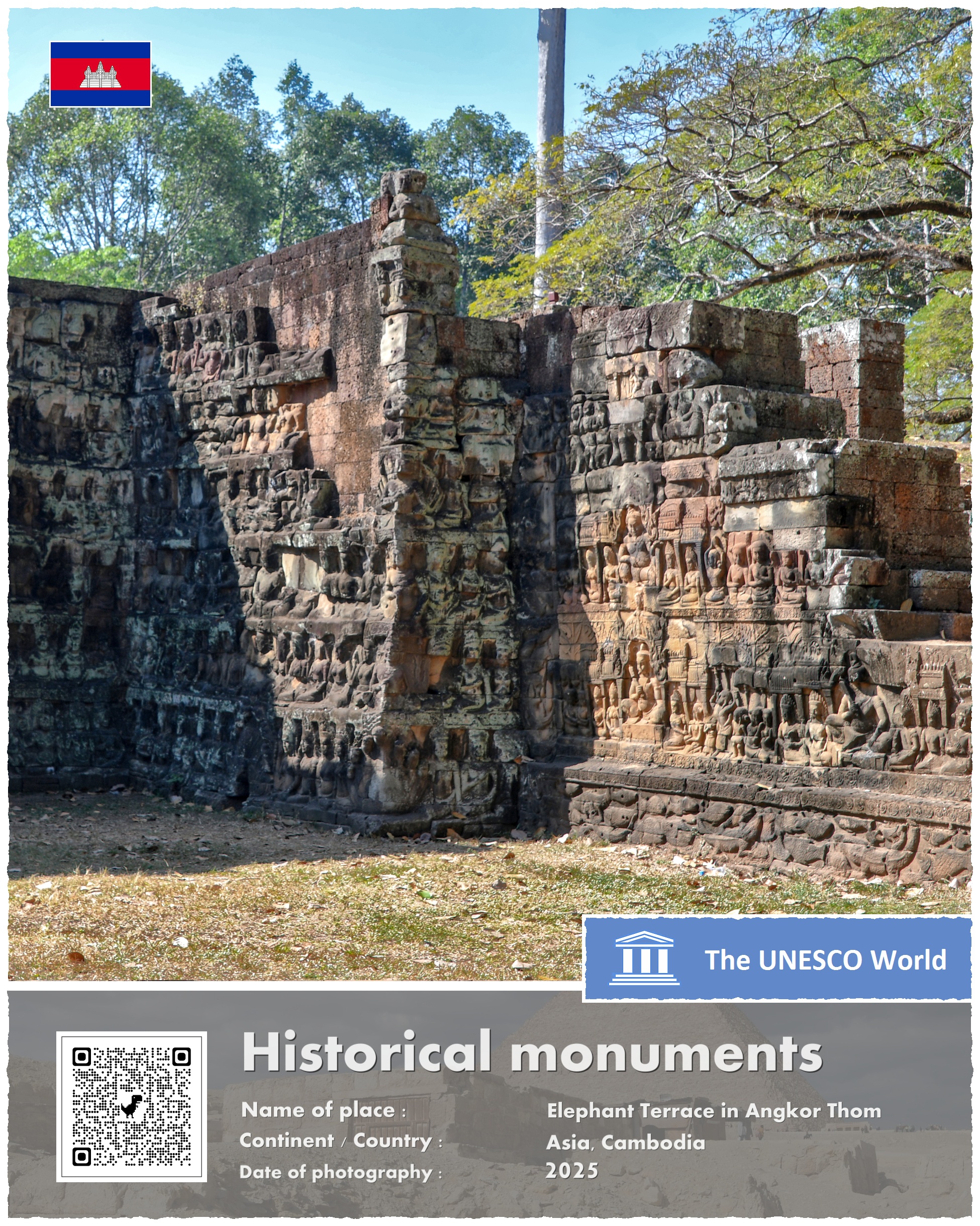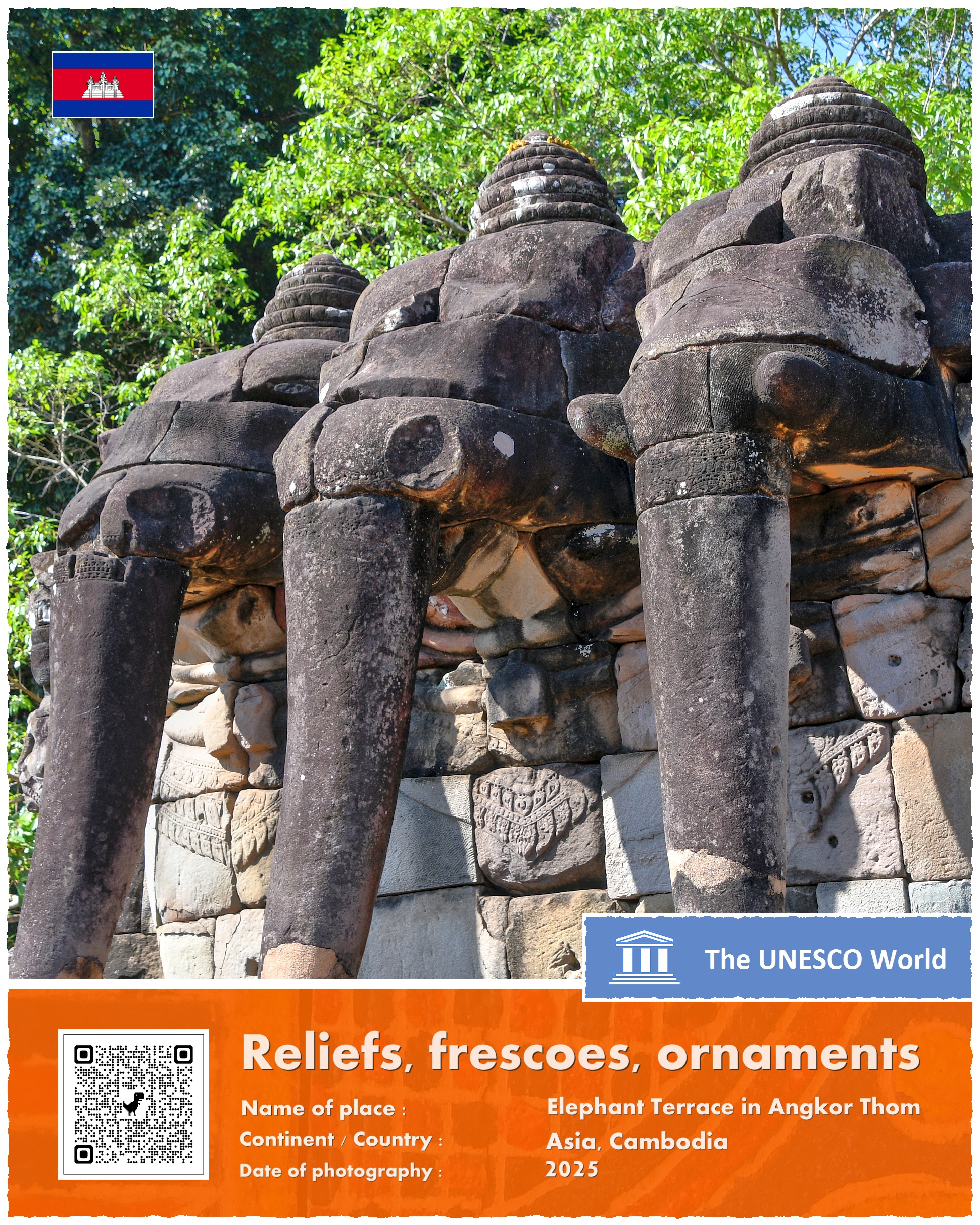 Terrace of the Elephants – bo tak brzmi oficjalna nazwa zabytku – znajduje się na terenie głównego kompleksu świątyń w Angkor, a dokładniej na zachodniej ścianie Angkor Thom, trzy i pół kilometra na północ od słynnego kompleksu Angkor Wat. Platforma ma 350 metrów długości i kilka metrów wysokości. Jej wschodnia ściana – zwrócona w kierunku Pałacu Królewskiego – jest bogato zdobiona rzeźbami ptaków, lwów, tancerek Apsar oraz wojowników.
