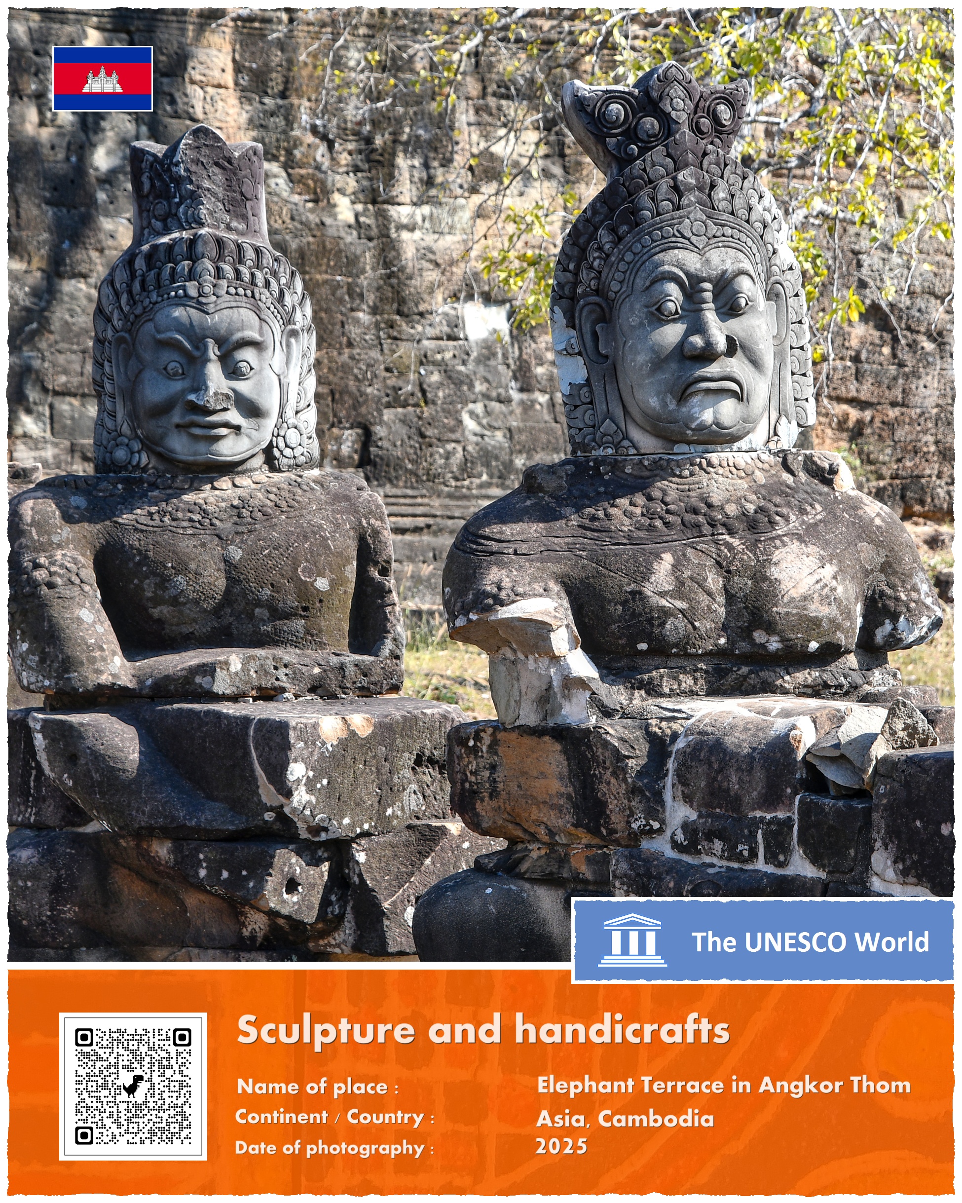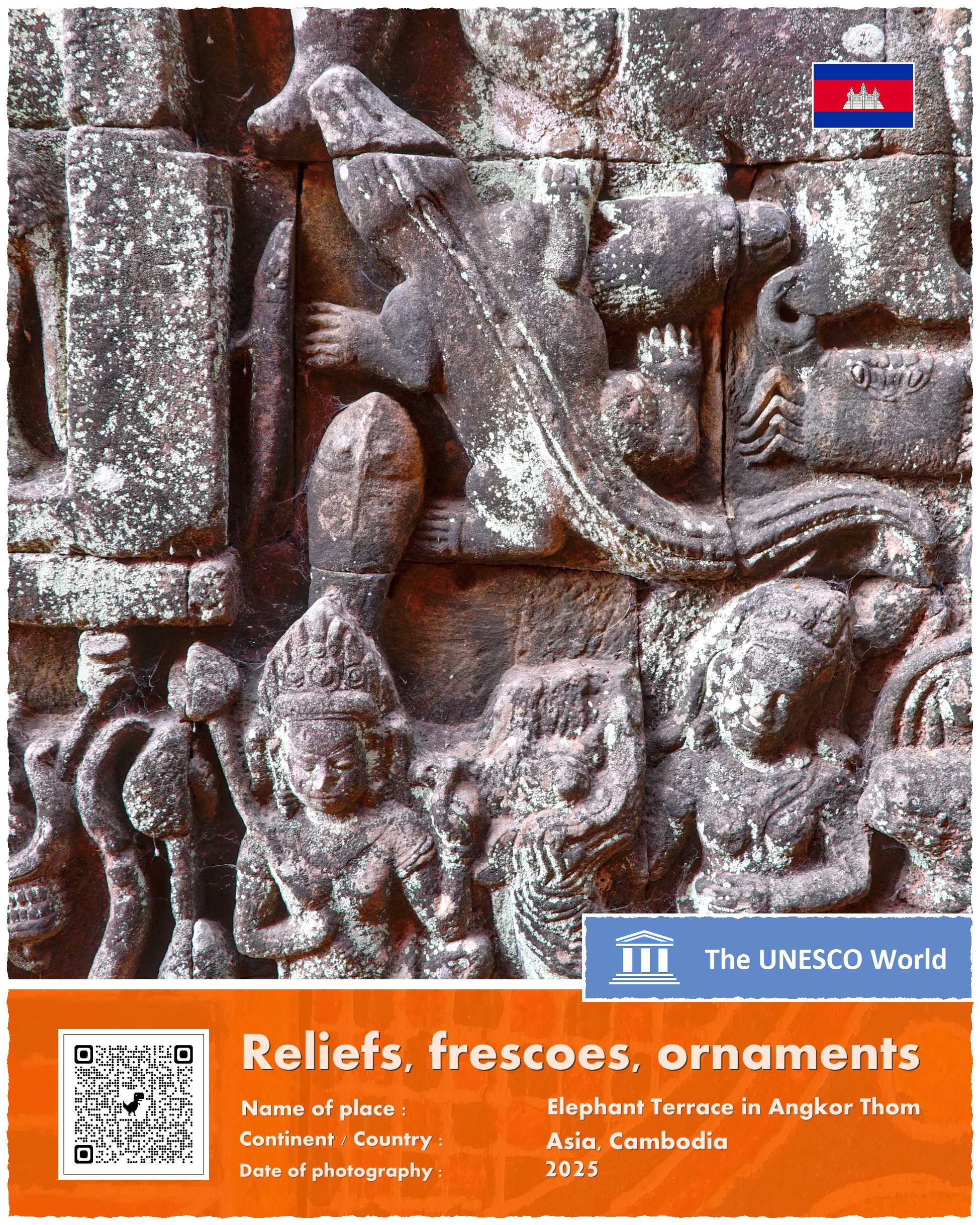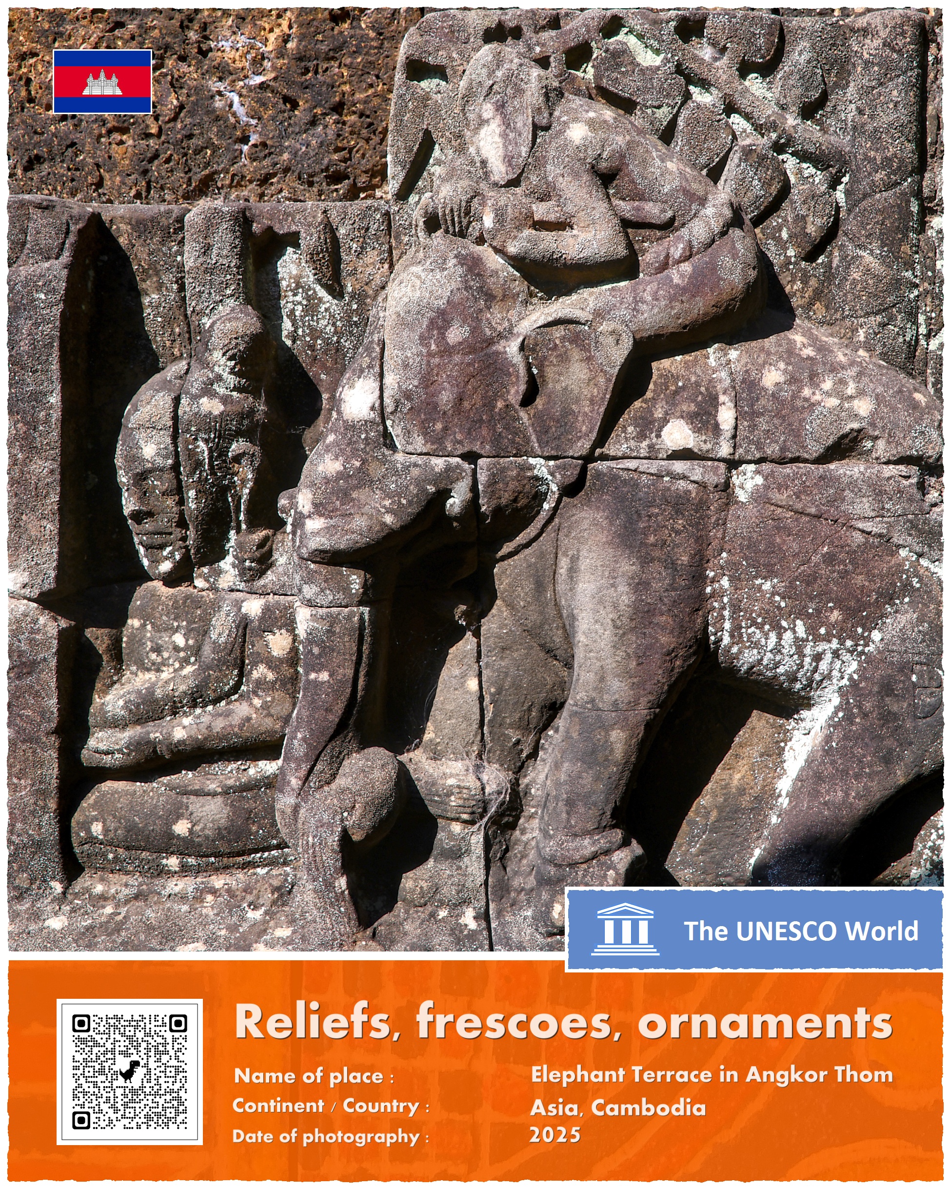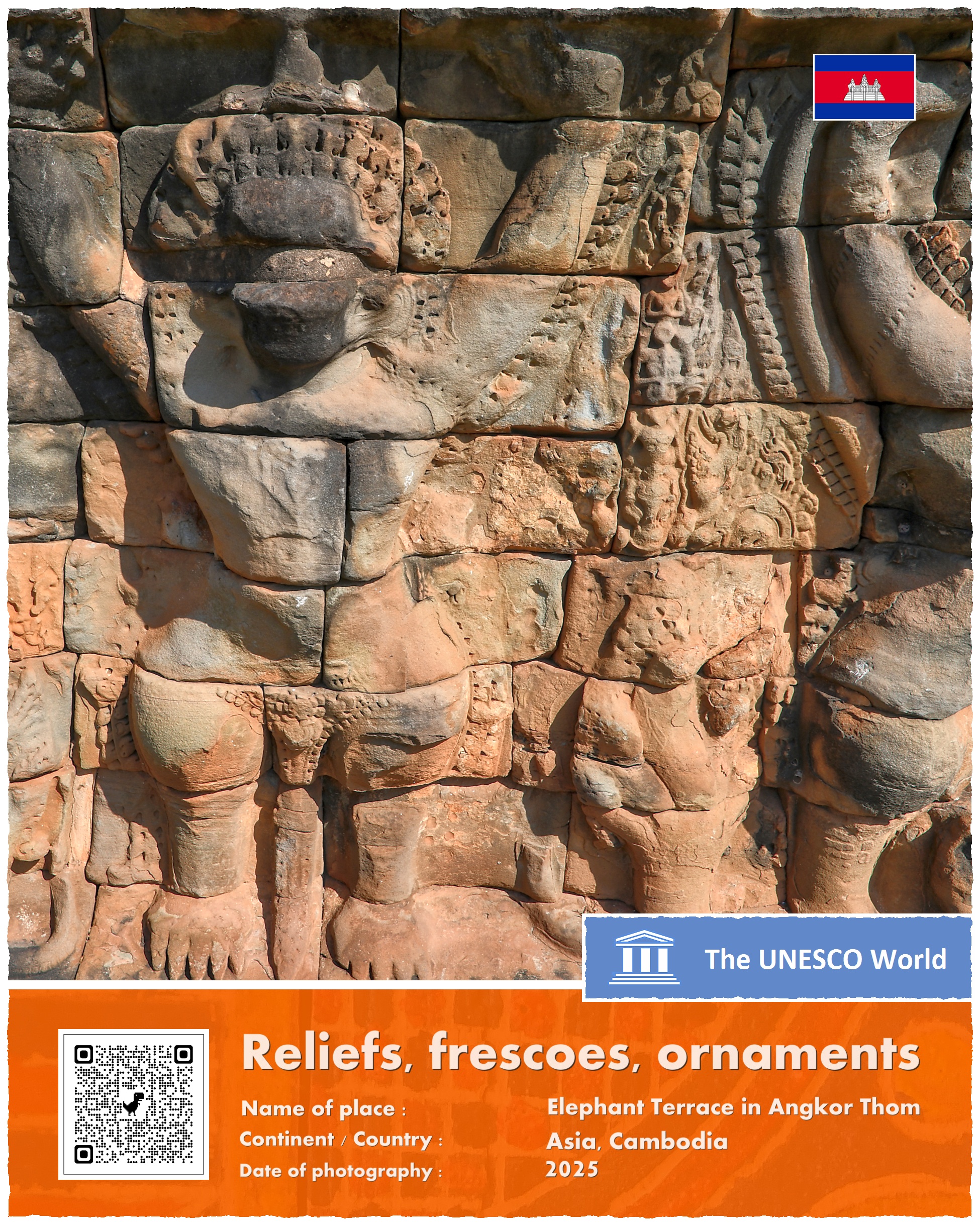 Terrace of the Elephants – bo tak brzmi oficjalna nazwa zabytku – znajduje się na terenie głównego kompleksu świątyń w Angkor, a dokładniej na zachodniej ścianie Angkor Thom, trzy i pół kilometra na północ od słynnego kompleksu Angkor Wat. Platforma ma 350 metrów długości i kilka metrów wysokości. Jej wschodnia ściana – zwrócona w kierunku Pałacu Królewskiego – jest bogato zdobiona rzeźbami ptaków, lwów, tancerek Apsar oraz wojowników.