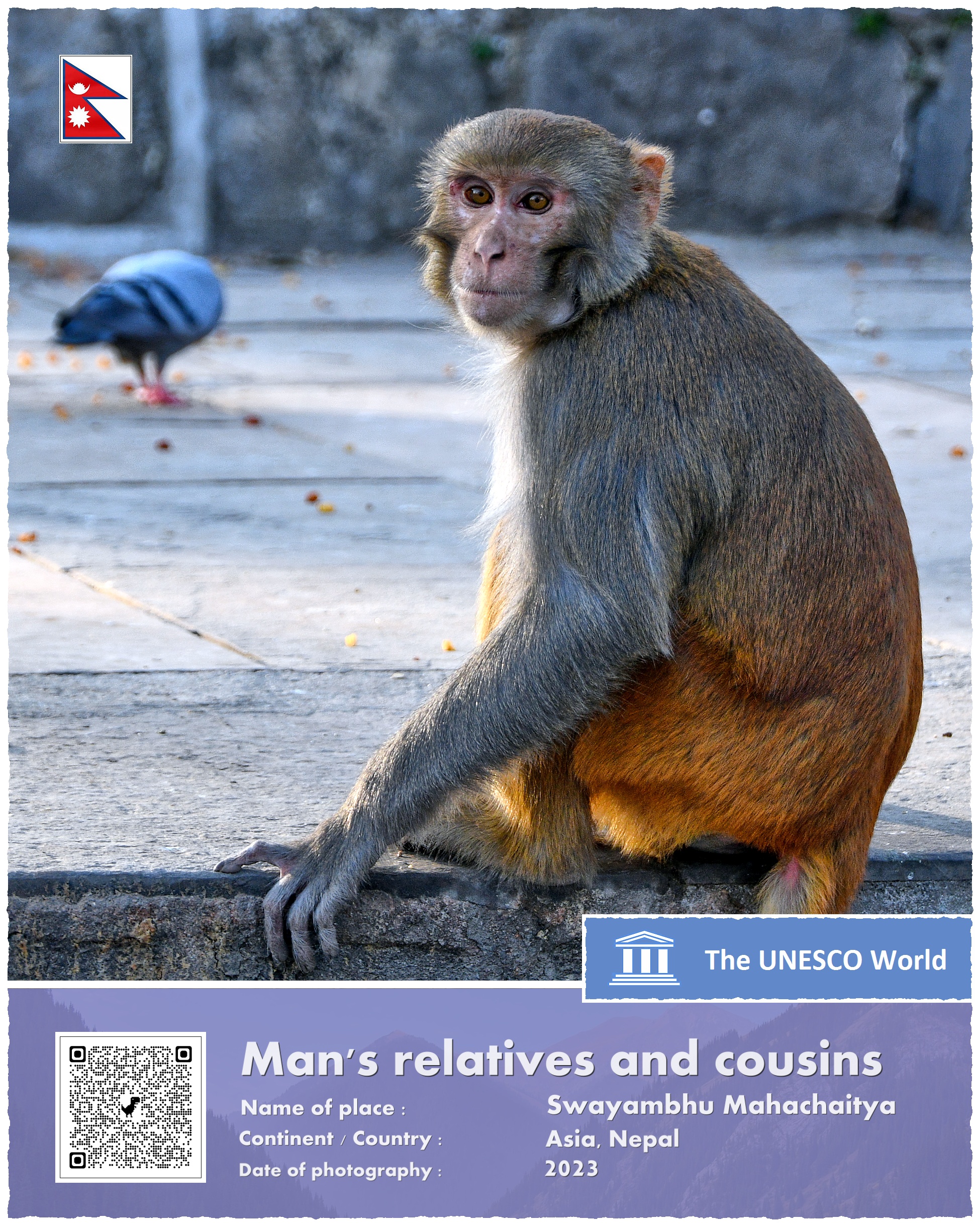 Kilkaset szerokich schodów wiedzie na szczyt wzgórza. Las porastający jego zbocza opanowały stada małp liczące setki osobników – stąd inna nazwa używana głównie przez turystów – Świątynia Małp. Zwierzęta te są rozwydrzone, agresywne, bardzo spostrzegawcze i pewne siebie. Bezwzględnie atakują każdego u kogo zobaczą coś, co w ich przekonaniu nadaje się do zjedzenia. Dlatego też wchodząc do góry zadbajcie o to, byście nie mieli przy sobie nic, co mogłoby sprowokować małpy do ataku. Nie są głodne i nie trzeba ich dokarmiać – zajmują się tym przeszkolone osoby.