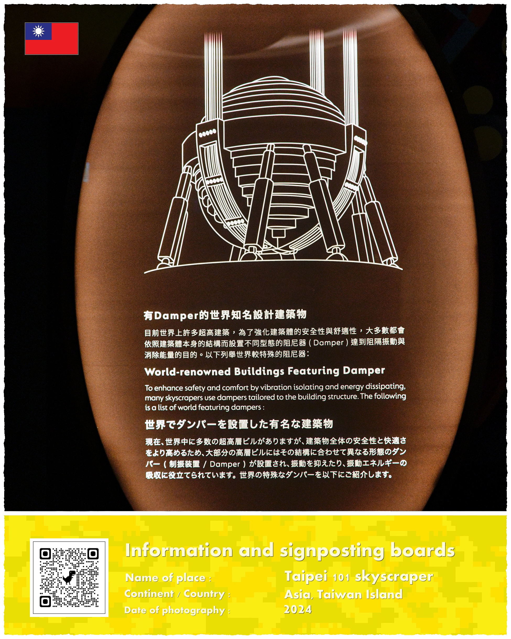 Tak wysoki wieżowiec narażony był od samego początku swojego istnienia na ekstremalnie groźne wstrząsy tektoniczne, które są częstym zjawiskiem zarówno na samej wyspie Tajwan, jak i w szerzej rozumianym tutejszym regionie geograficznym. Dlatego też planujący jego konstrukcję architekci oraz inżynierowie wymyślili niezwykły mechanizm, dzięki któremu budynek stał się jeszcze bardziej rozpoznawalny: zawieszoną w jego wnętrzu ogromną kulę pełniącą rolę stabilizatora wstrząsów.