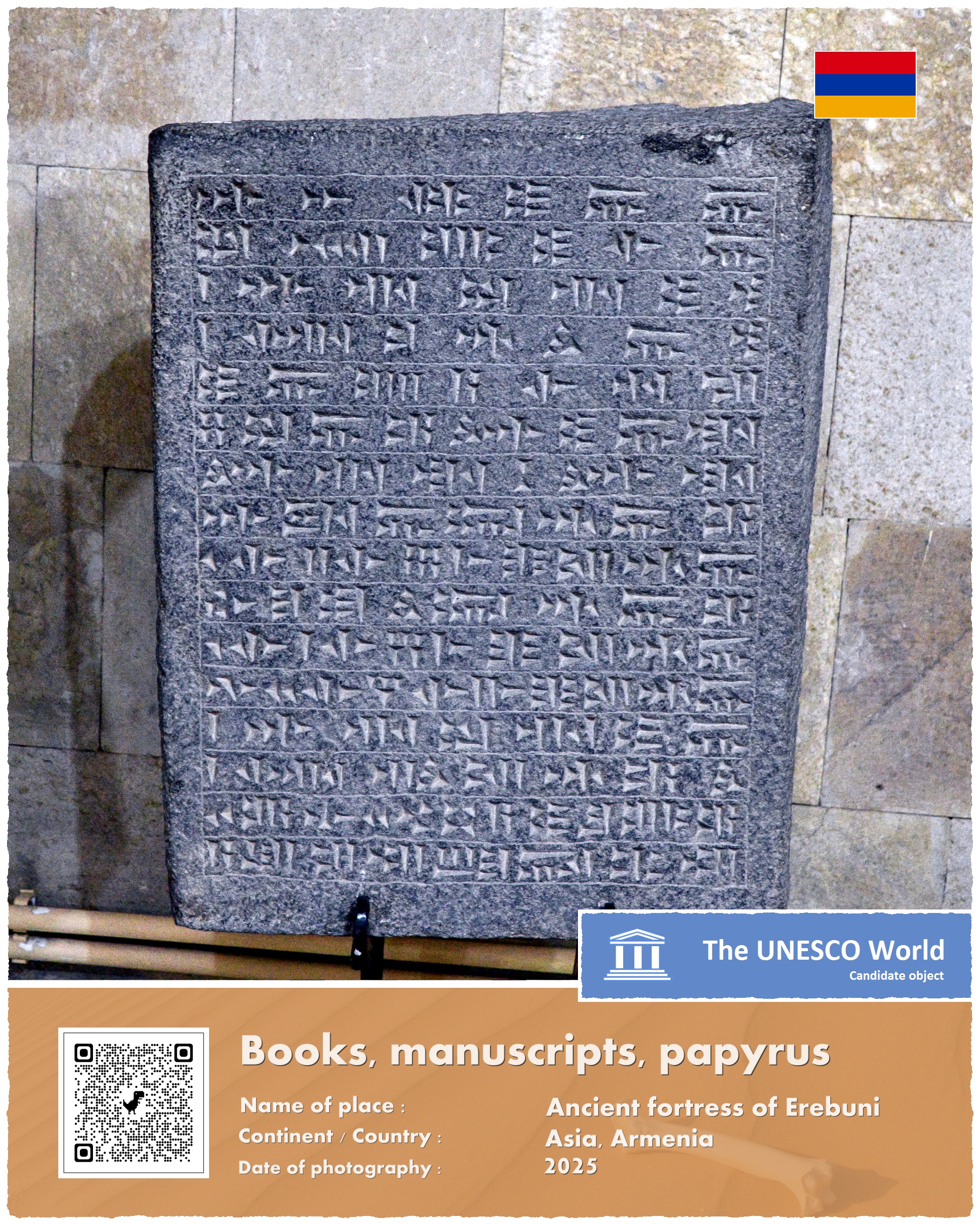 Stanowisko archeologiczne Erebuni, położone na południowo-wschodnich obrzeżach Erywania, pomiędzy dzielnicami Wardaszen i Nor Aresz, zajmuje centralne miejsce w historii Armenii i szeroko pojętego starożytnego Bliskiego Wschodu. Stanowi ono miasto-twierdzę, założone przez Argisztiego I (ok. 785/780–756 p.n.e.), jednego z najpotężniejszych królów Królestwa Urartu. M. Salvini, W. Kuntner, S. Heinsch i inni wybitni urartolodzy podkreślają w swoich pracach, że nazwa Erebuni pochodzi od Erebuni. Dlatego odkrycie urartyjskich inskrypcji klinowych na tym stanowisku, szczegółowo opisujących powstanie miasta-twierdzy, stanowi niezwykły kamień milowy w historii – czyniąc te inskrypcje „aktem urodzenia” Erywania.