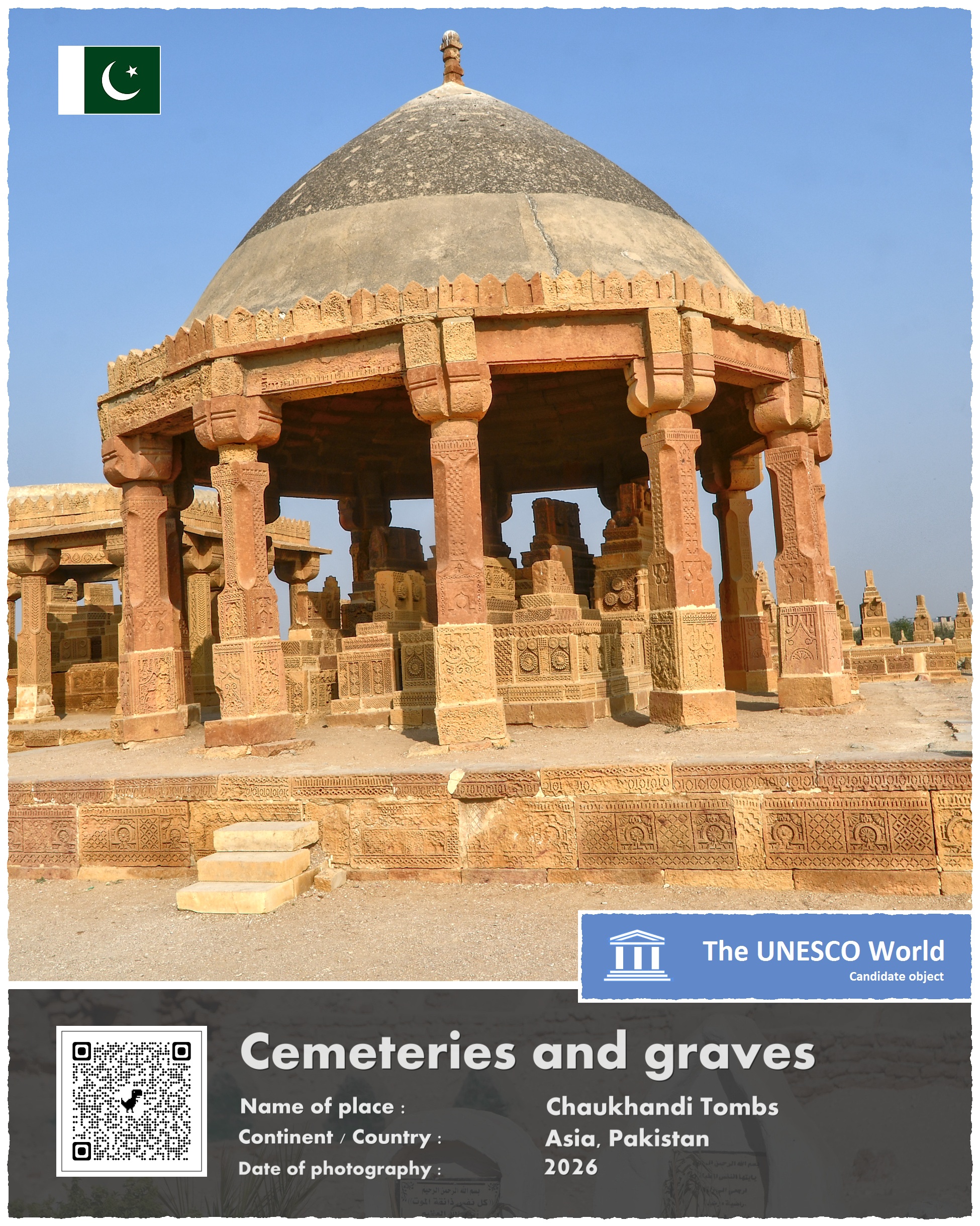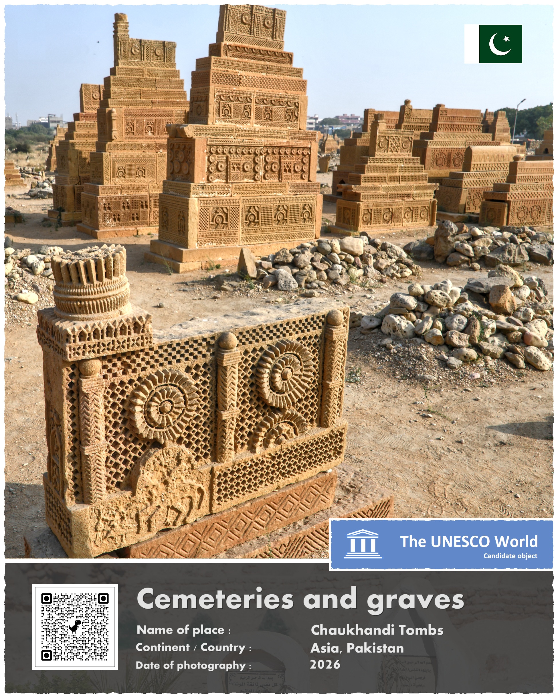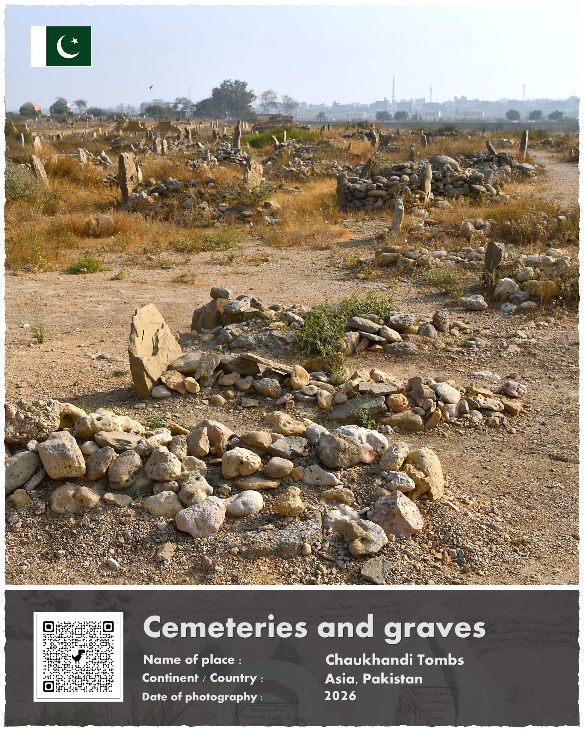 Cmentarz, który pragnę Wam dziś zaprezentować, leży w Pakistanie, około 30 kilometrów na wschód od centrum Karaczi, największego miasta tego kraju. Powstał mniej więcej na początku XVI wieku, w czasach gdy regionem tym rządziła dynastia Mogołów. Choć nowi władcy tej krainy byli wyznawcami Allaha, to ich zwyczaje pogrzebowe wyróżniały się znacznie od wielu innych muzułmanów. Otóż dopuszczali oni, by groby zmarłych były bogato zdobionymi pomnikami – a nie jak nakazuje tradycja skromnymi pochówkami, często tylko niedbale zaznaczonymi przypadkowym wręcz kamieniem…