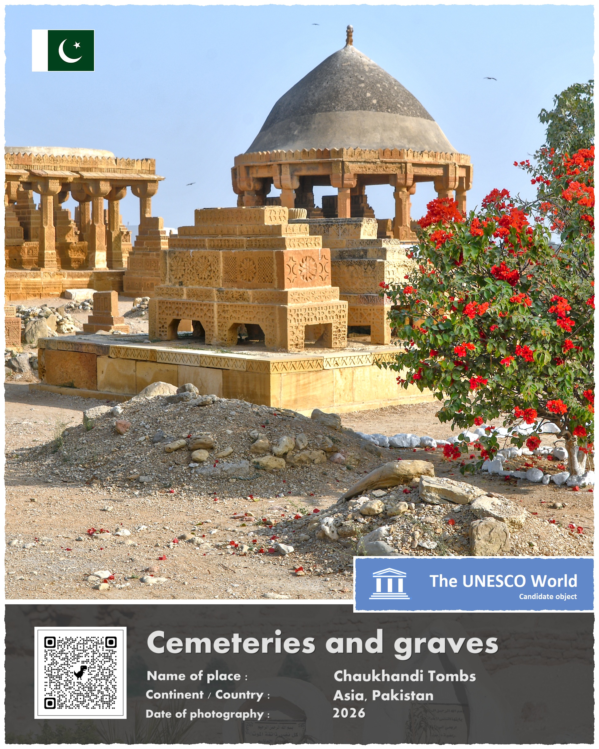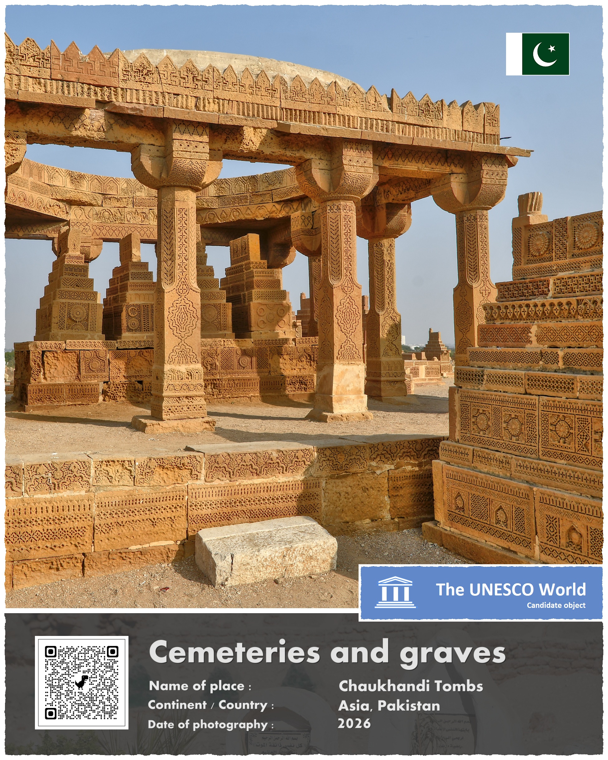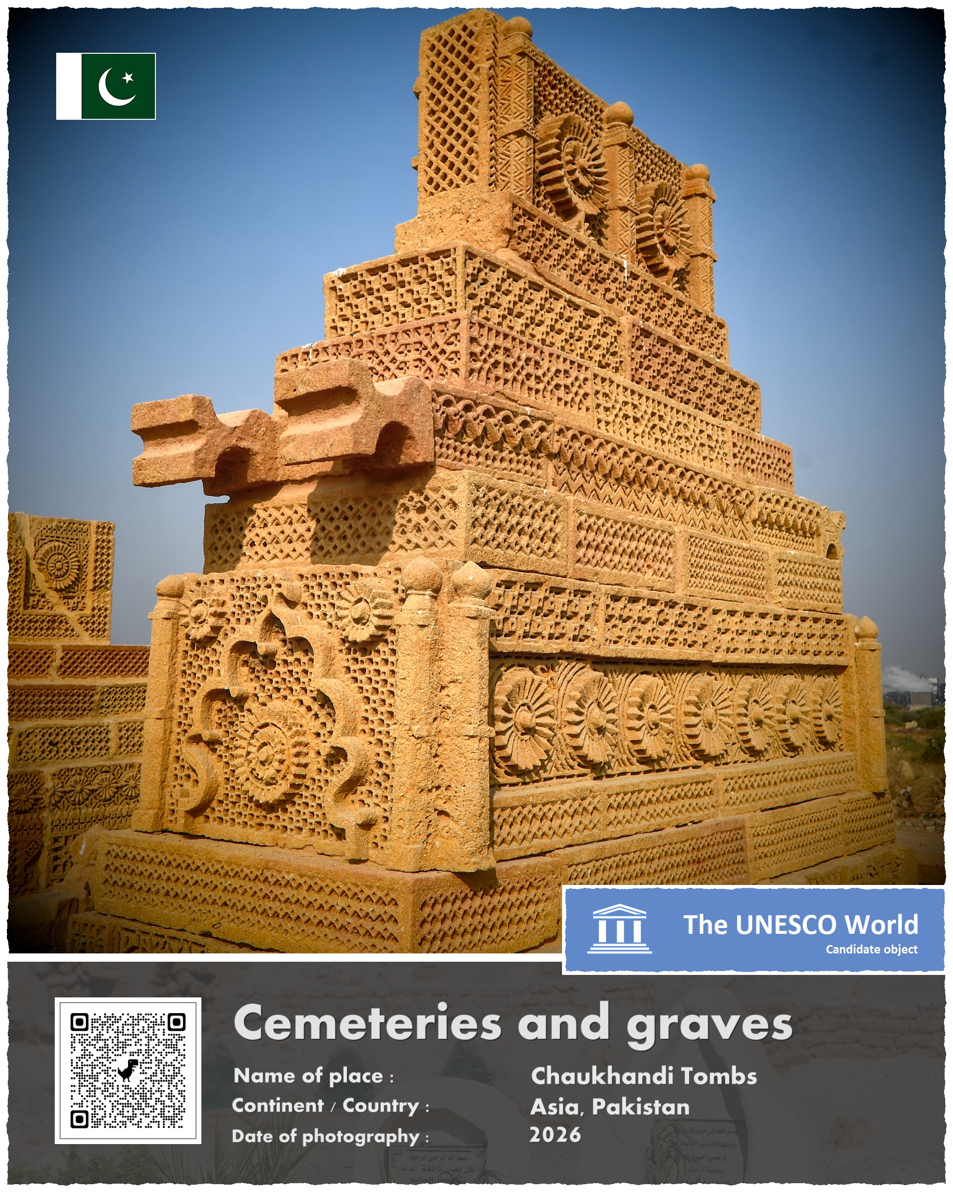 Cmentarz, który pragnę Wam dziś zaprezentować, leży w Pakistanie, około 30 kilometrów na wschód od centrum Karaczi, największego miasta tego kraju. Powstał mniej więcej na początku XVI wieku, w czasach gdy regionem tym rządziła dynastia Mogołów. Choć nowi władcy tej krainy byli wyznawcami Allaha, to ich zwyczaje pogrzebowe wyróżniały się znacznie od wielu innych muzułmanów. Otóż dopuszczali oni, by groby zmarłych były bogato zdobionymi pomnikami – a nie jak nakazuje tradycja skromnymi pochówkami, często tylko niedbale zaznaczonymi przypadkowym wręcz kamieniem…