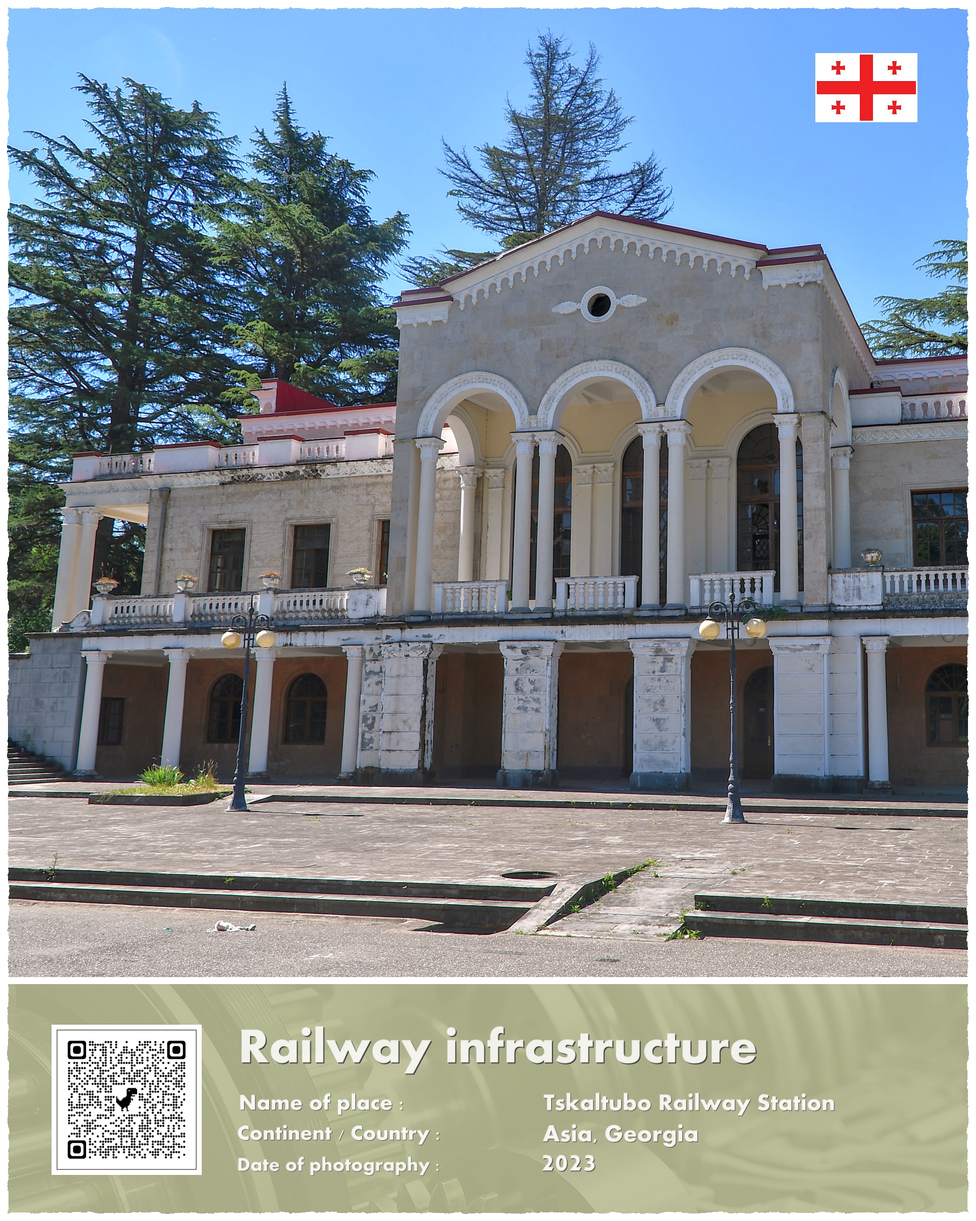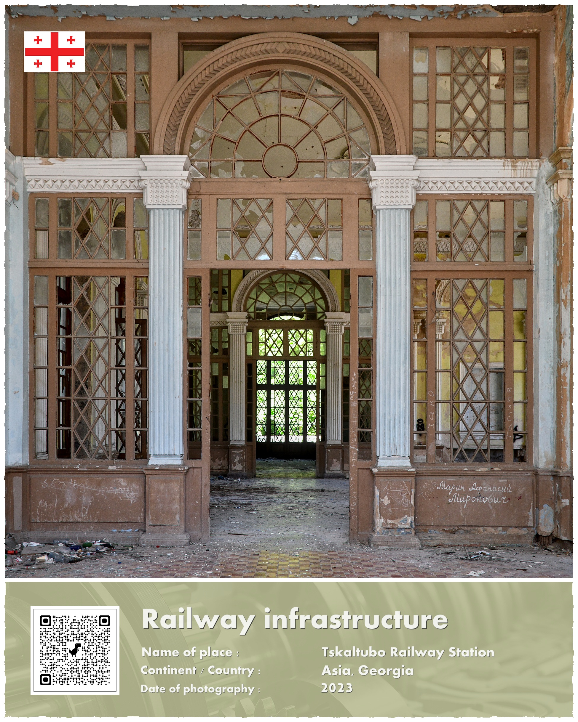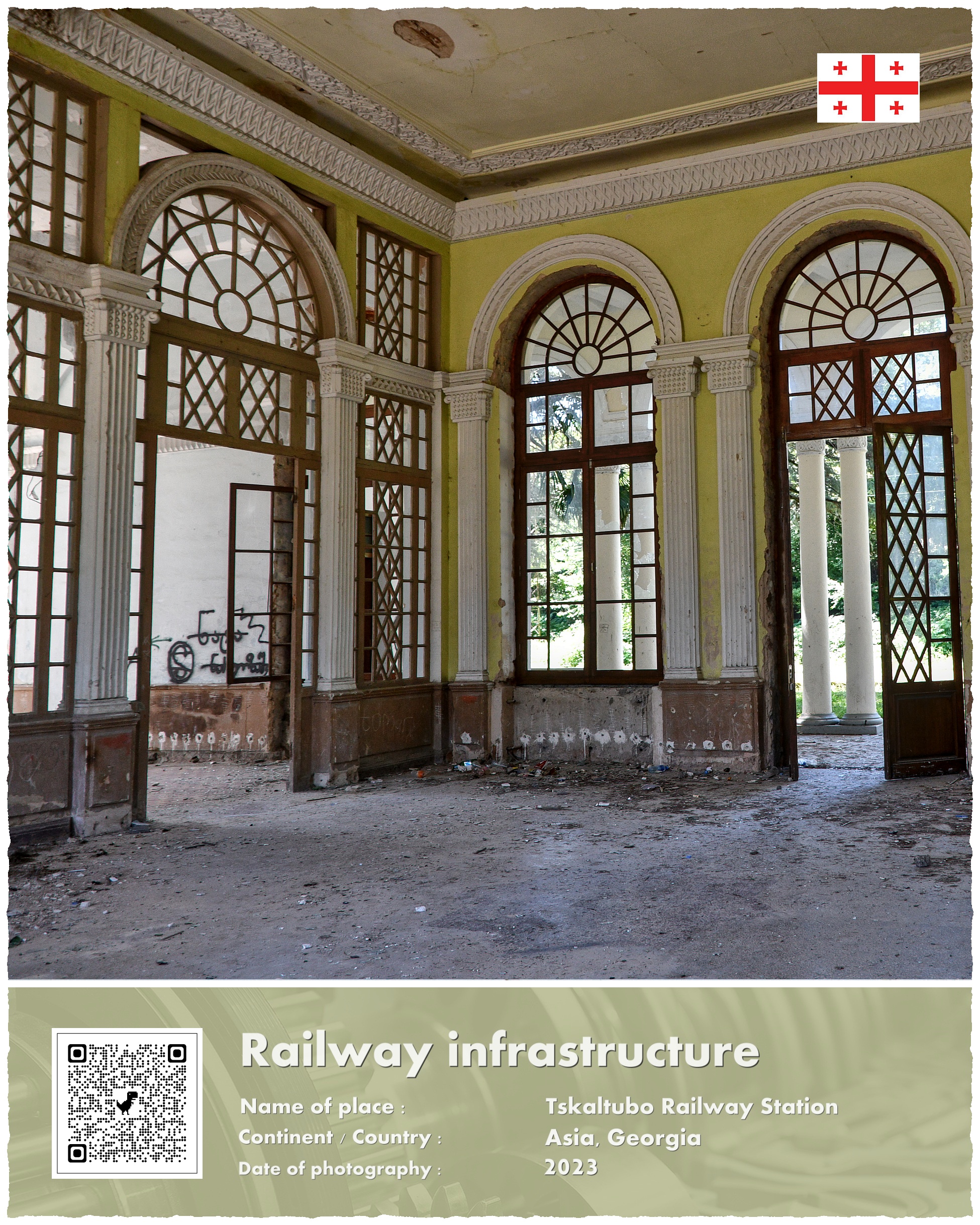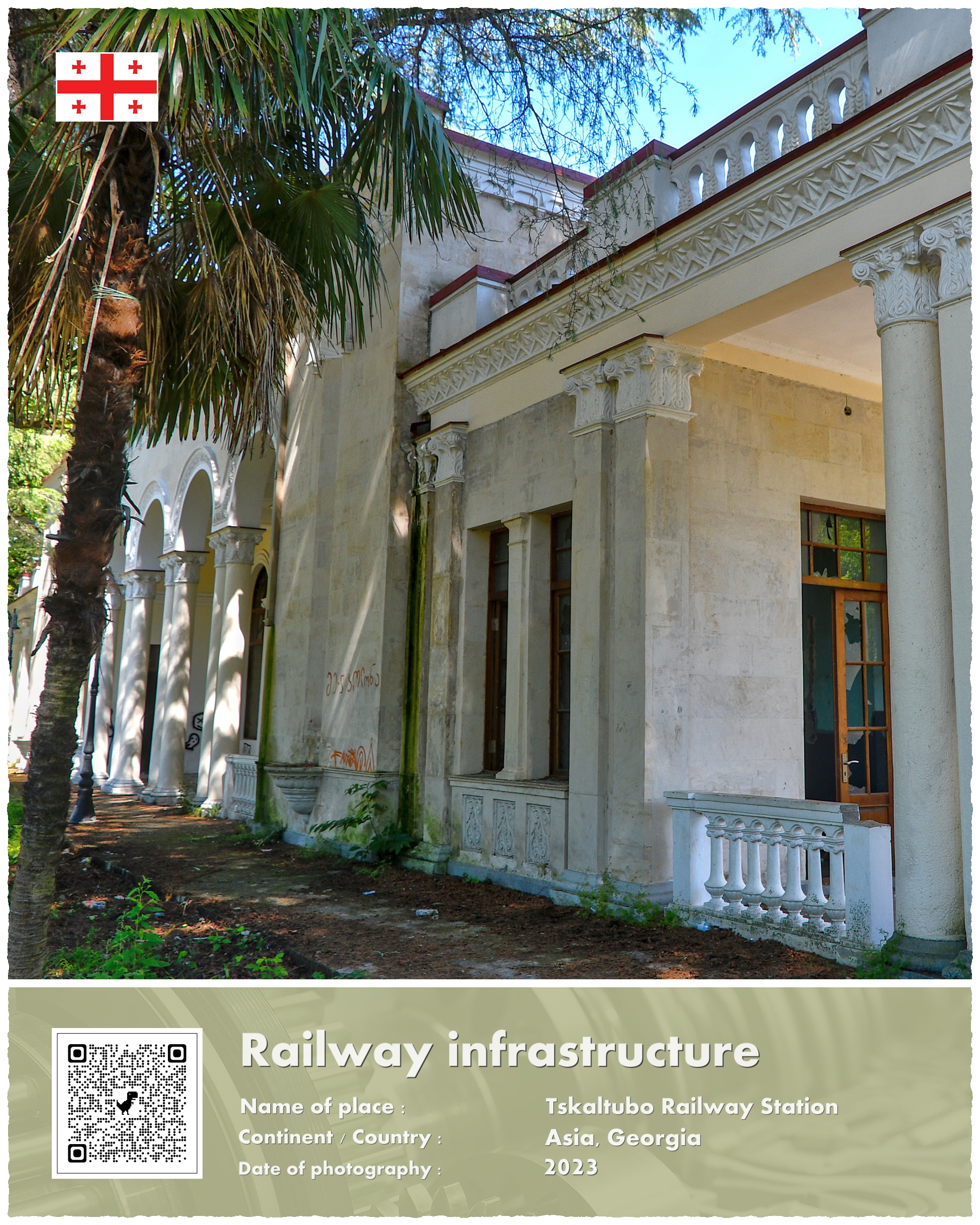 Dworzec kolejowy – Tskaltubo Railway Station – stoi sobie opuszczony i niedozorowany, a wstęp do niego jest otwarty; podczas naszego pobytu nie było tu nawet najprostszych zabezpieczeń takich jak jakaś kłódka, łańcuch, czy zabite deskami okna. To miłe! Lata świetności stacji to czasy panowania Związku Radzieckiego, kiedy to do tutejszych uzdrowisk przybywało nawet sto tysięcy kuracjuszy rocznie. Wszyscy oni przyjeżdżali pociągami – z całego niemal imperium, w tym z Moskwy.